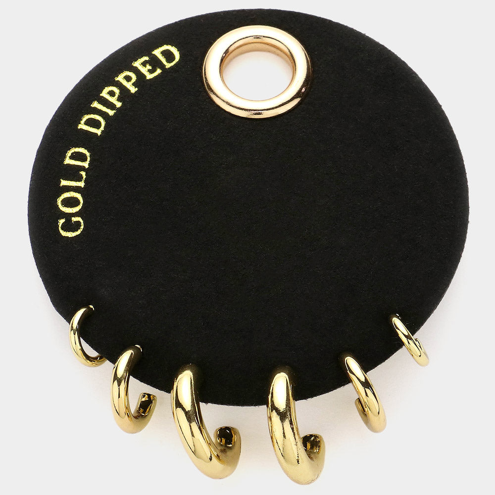 A classic 3-pair hoop set dipped in gold for a clean, polished shine. Each pair offers a different size, giving you simple choices for daily wear or a dressed-up look. Also available in white gold dipped.