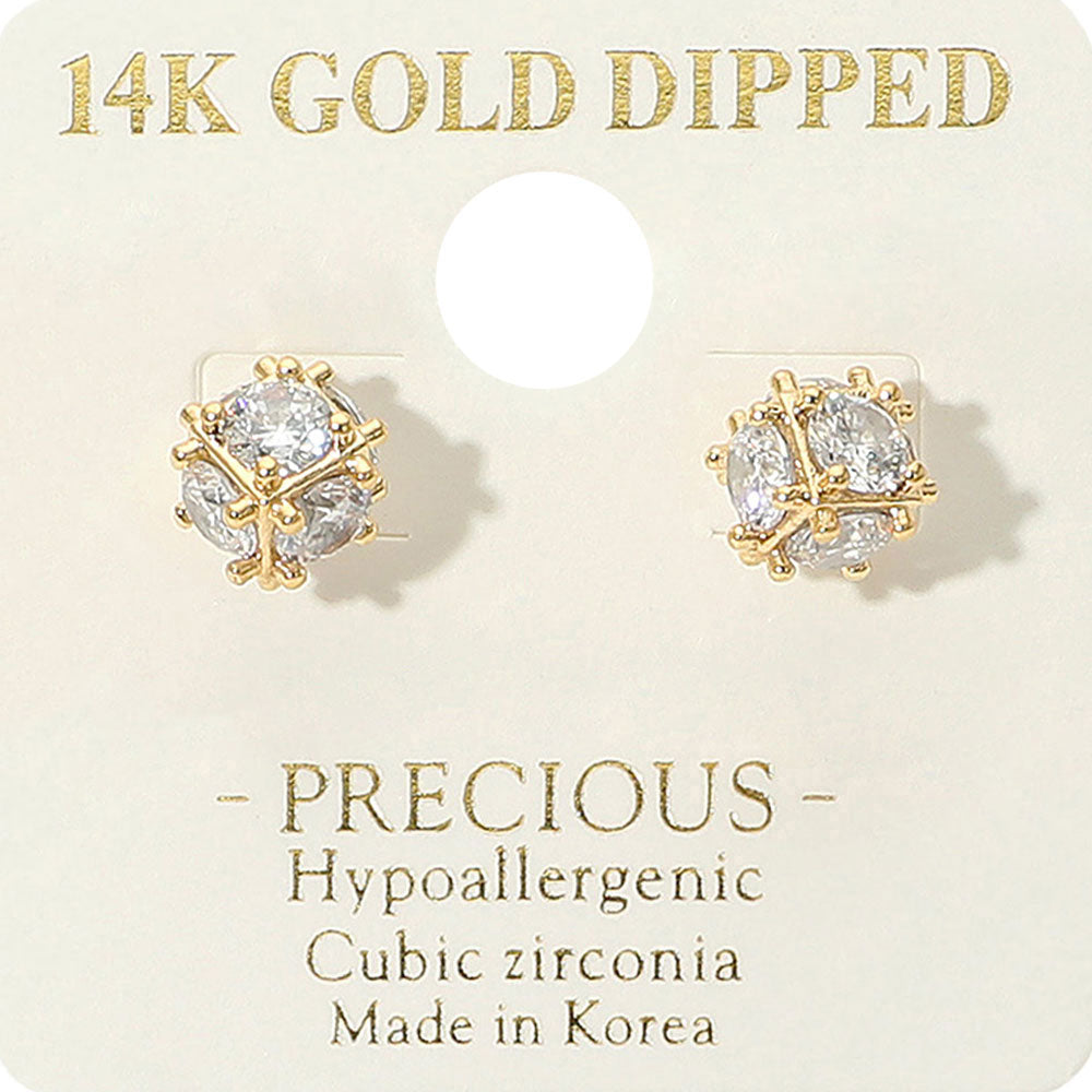Chic mini cube studs crafted with a hypoallergenic 14K gold dipped or white gold dipped finish. Accented with shimmering cubic zirconia stones for a simple yet eye-catching style.