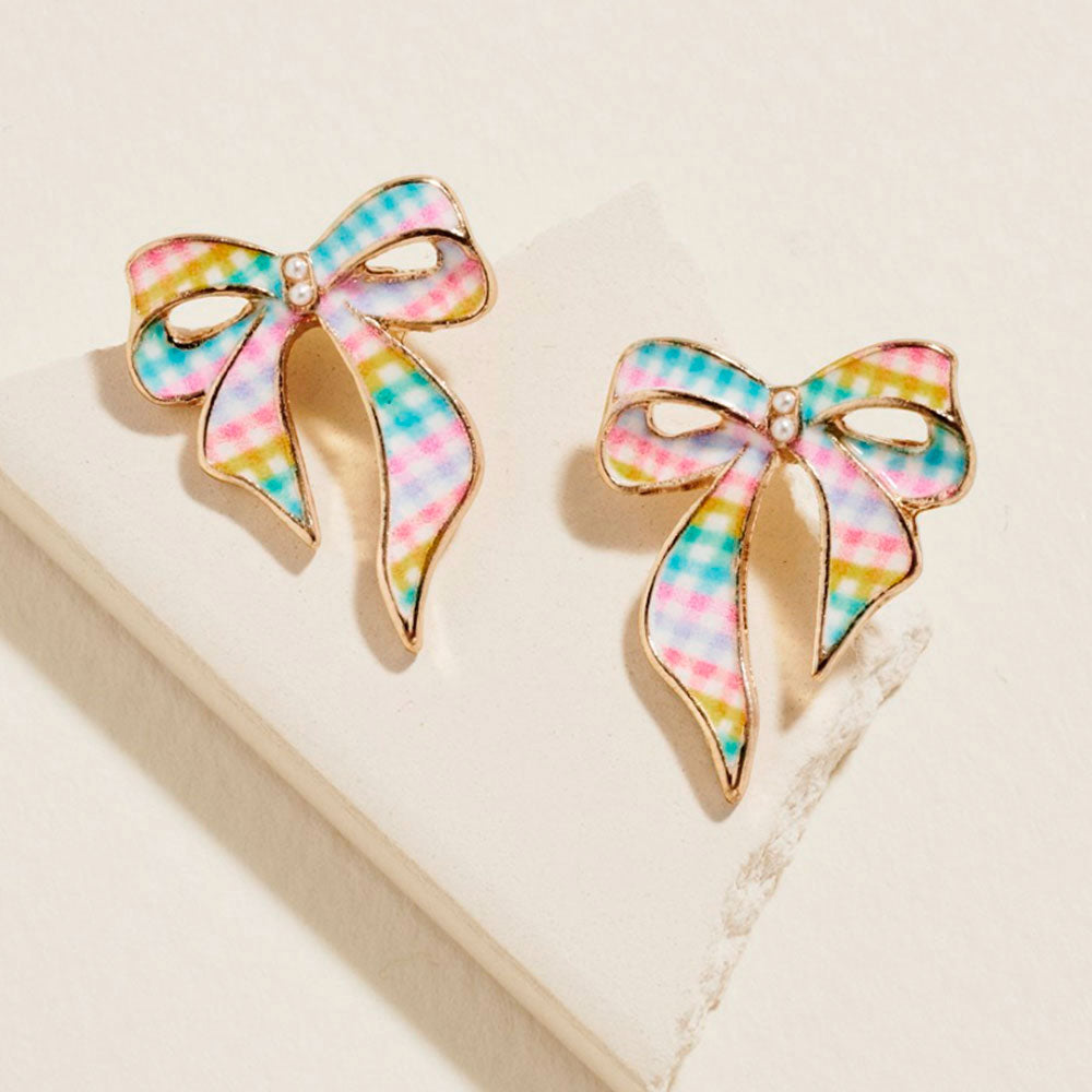 Sweet bow-shaped stud earrings featuring a classic gingham pattern for a playful, charming look. Lightweight and easy to wear, perfect for adding a cute touch to your everyday or seasonal outfits.