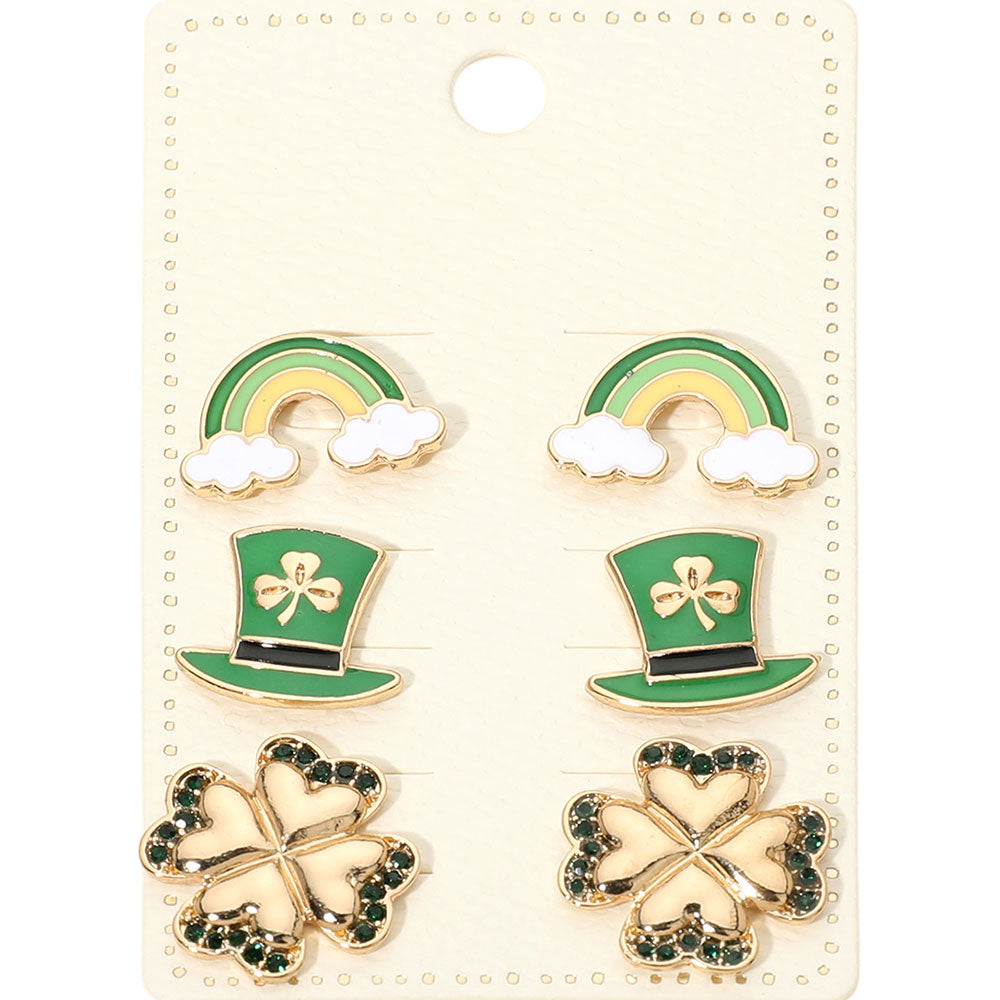 This 3-pair St. Patrick’s Day stud earring set features cheerful clover, leprechaun hat, and rainbow designs. Lightweight and easy to wear, each pair adds a festive pop of charm. Perfect for mixing, matching, and celebrating the luck of the Irish in style.