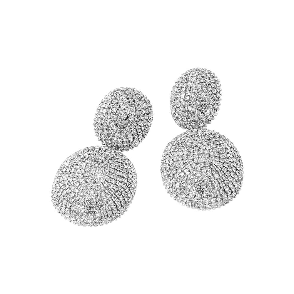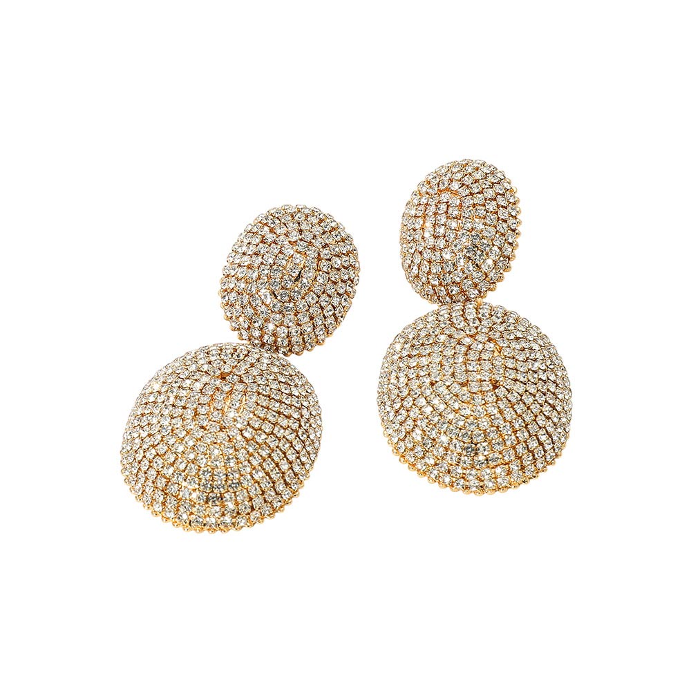 Bold rhinestone pave oval dome drop statement earrings in gold or silver. Features a dimensional oval dome design fully paved with sparkling rhinestones for a glamorous, eye-catching look. Perfect for evening events, parties, or adding a statement touch to any outfit.