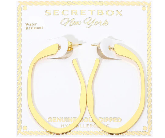 These flat open hoop earrings feature an organic shape with a smooth, modern finish for an effortless statement look. A lightweight, versatile style perfect for everyday wear. Also available in sterling silver.