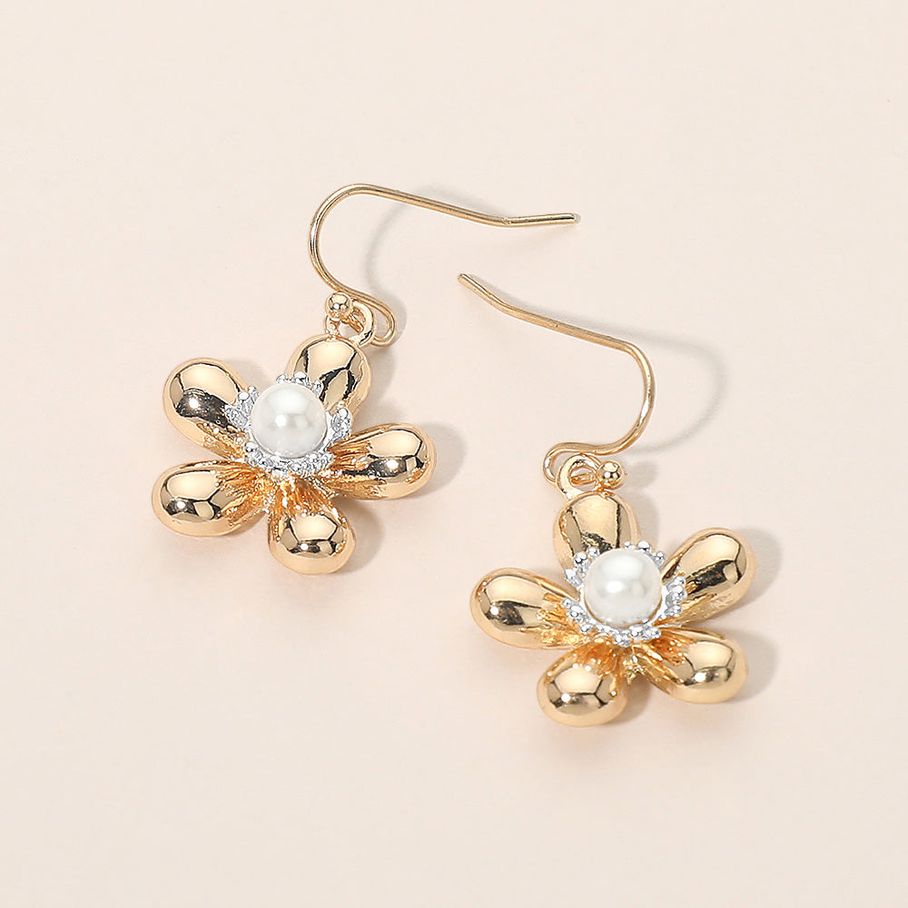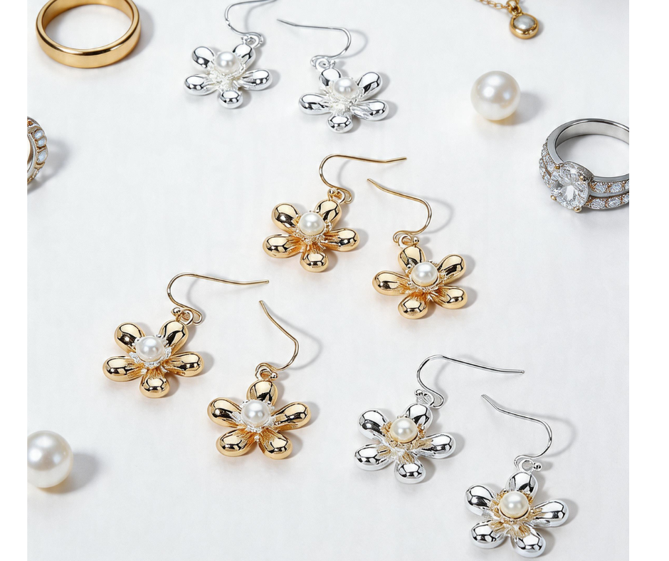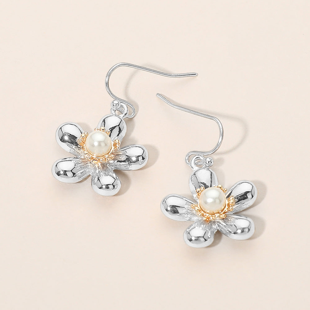 These earrings feature a pearl accent paired with two tone flower charm drops for a soft, eye-catching look. The mix of metals and delicate details creates a balanced design with gentle movement. Lightweight and comfortable, they’re perfect for everyday wear or adding a polished touch.