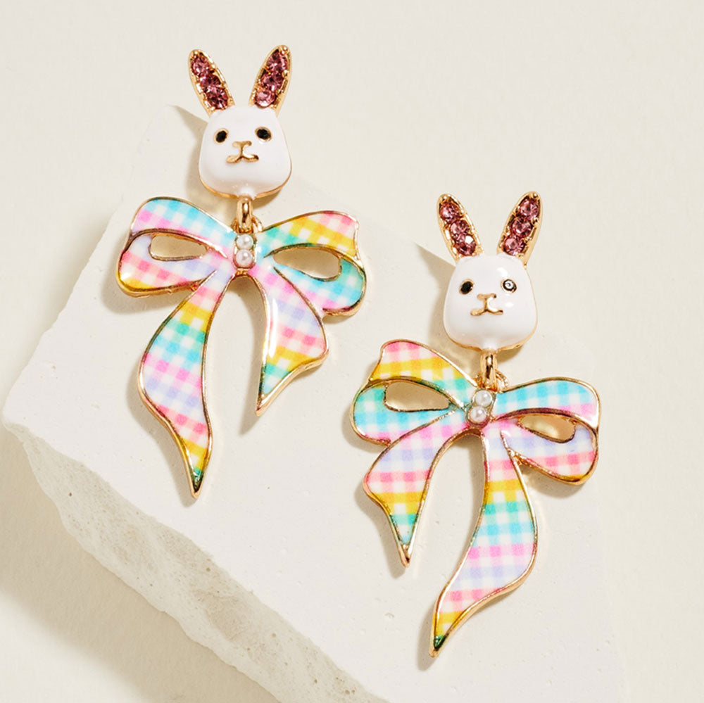 Cute drop dangle earrings featuring an Easter bunny design paired with a gingham bow accent for a sweet, festive look. Lightweight and playful, they’re perfect for Easter celebrations or adding a cheerful touch to your spring outfits.