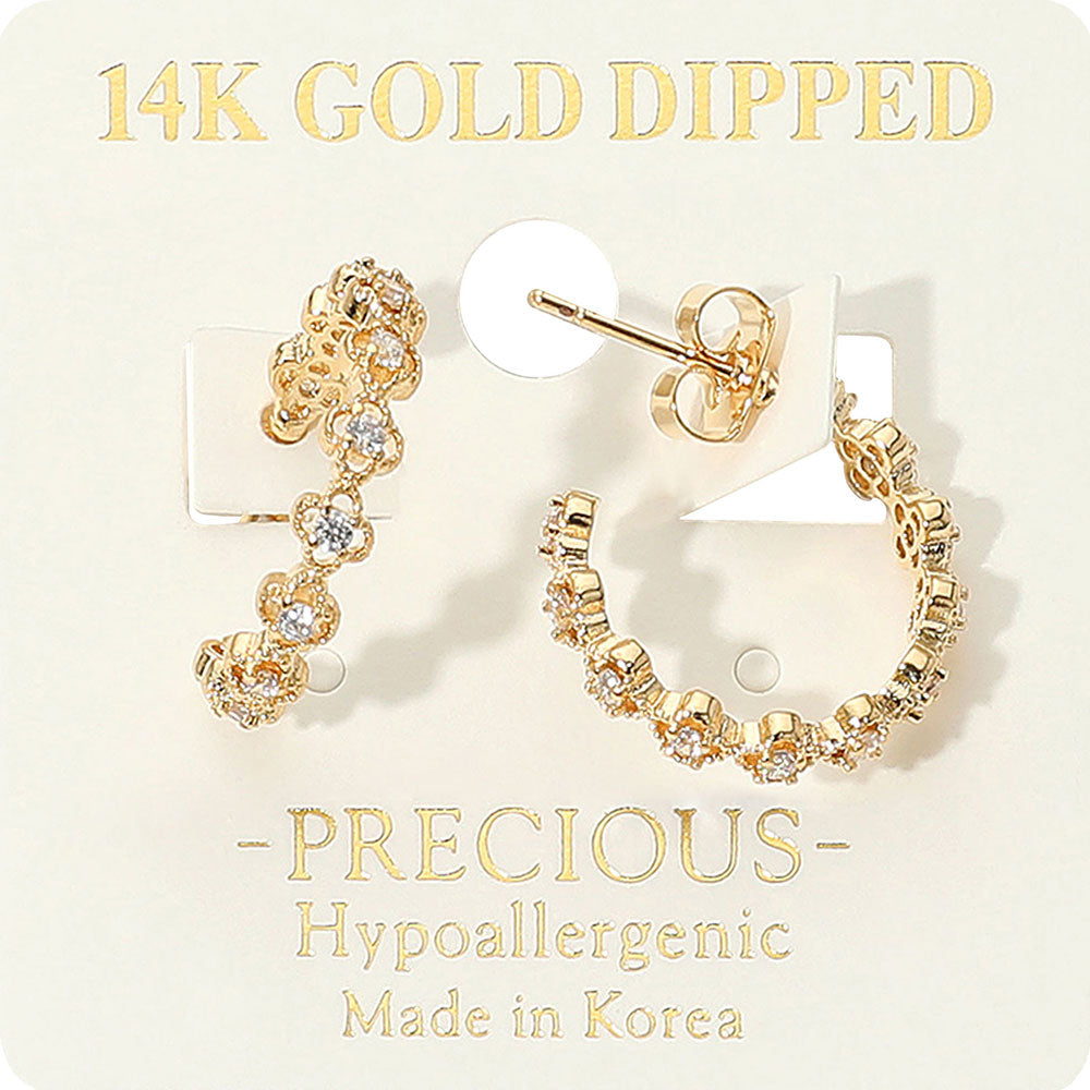 These open floral hoops feature a delicate design dipped in 14K gold, accented with sparkling rhinestones for a soft touch of shine. Crafted with hypoallergenic posts for comfortable wear, they offer a pretty and stylish look that pairs well with both casual and dressy outfits.