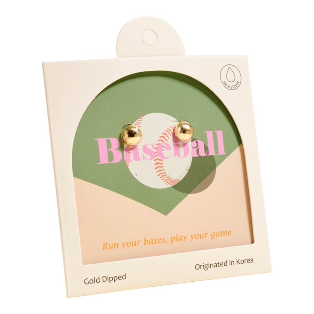 Gold dipped baseball mini stud earrings. Cute and casual, these earrings show off your love for the game. Perfect for everyday wear or pairing with other fun studs.