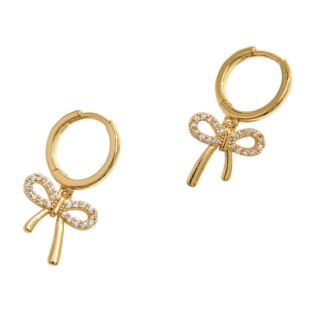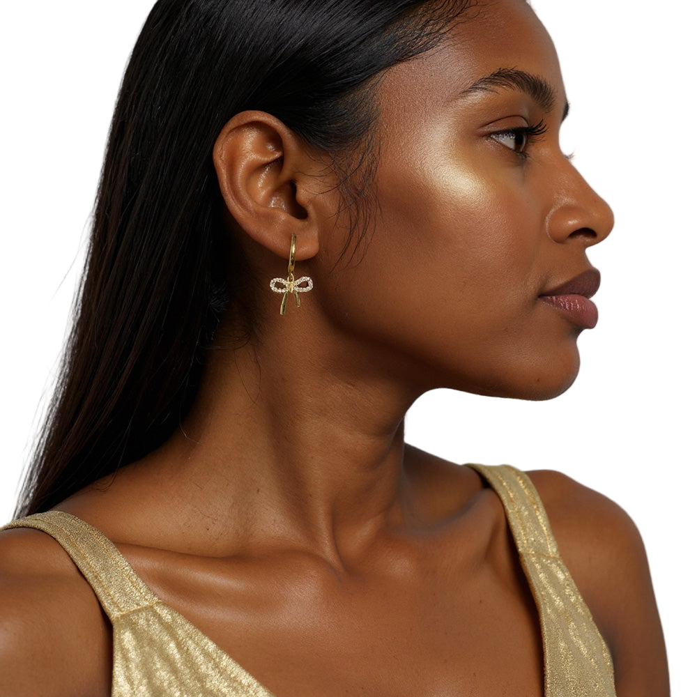 Delicate and feminine, these 14K gold dipped huggie hoop earrings feature sparkling cubic zirconia stones and a charming bow dangle accent. A perfect blend of elegance and sparkle that adds a graceful touch to any outfit.