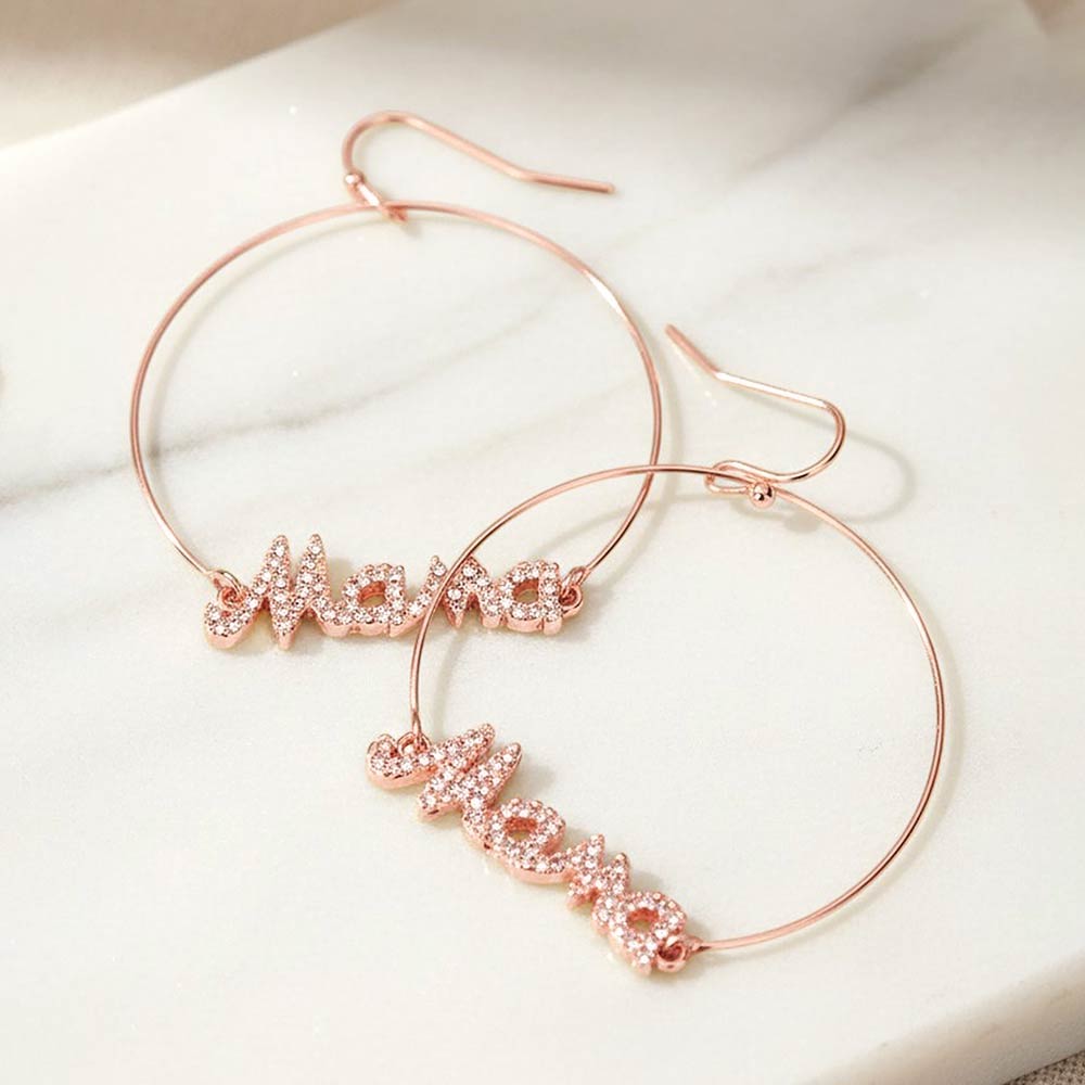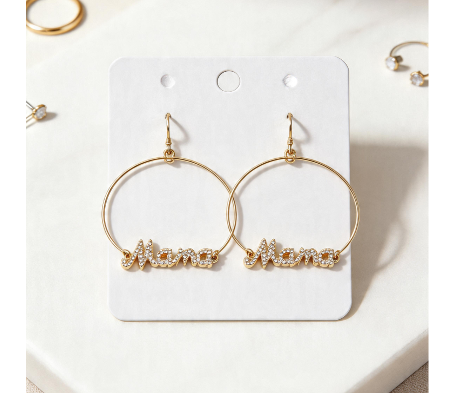 These hoop earrings feature a “Mama” front design with rhinestone accents and a dangle detail for a fun, eye-catching look. The sparkling finish adds shine while keeping the style playful and meaningful. Perfect for everyday wear or gifting.