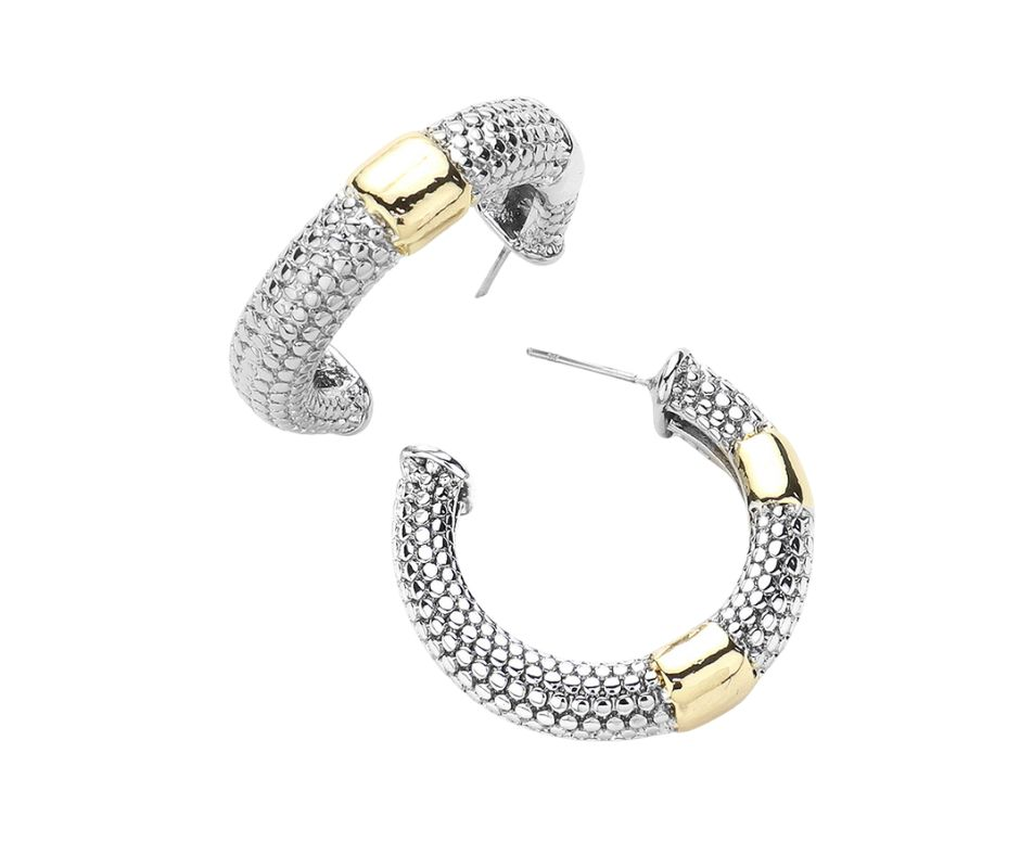These hoop earrings feature a two-tone metal design with a textured finish for added depth and shine. A versatile style that brings a modern touch to your everyday look.