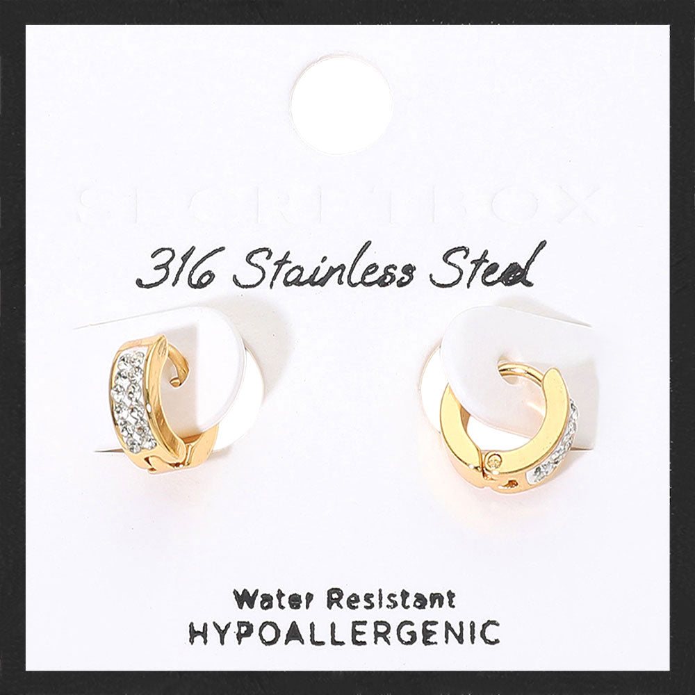 These small stainless steel huggie hoops feature a smooth, polished finish with stone paving for a soft touch of sparkle. Lightweight and comfortable for everyday wear, they’re a simple and stylish addition to any jewelry collection.