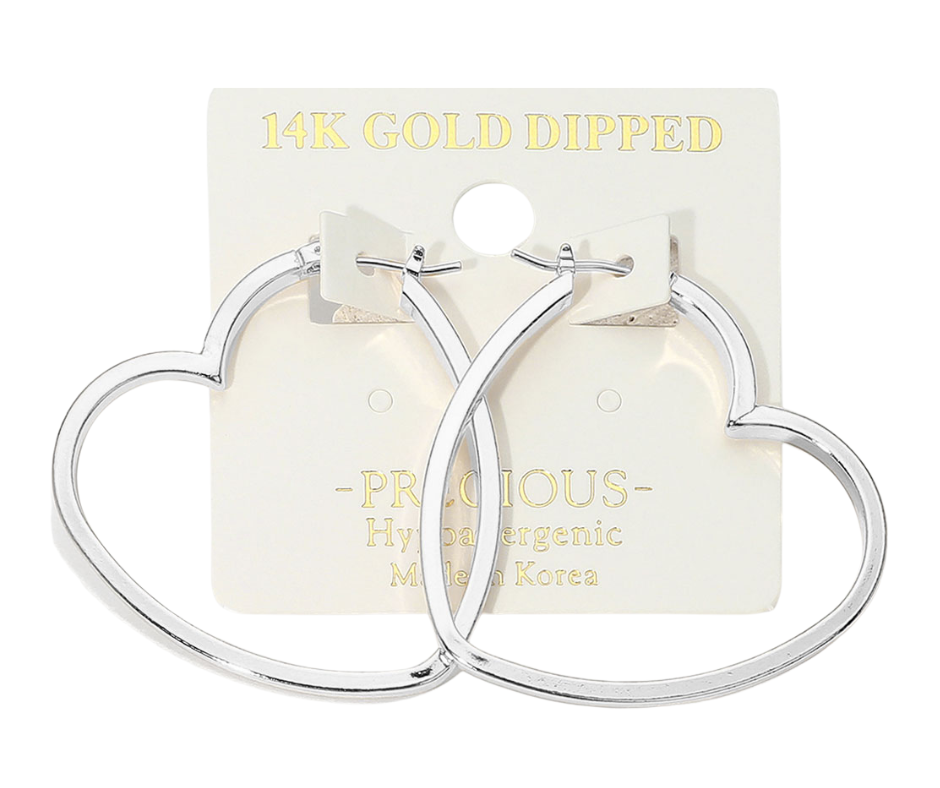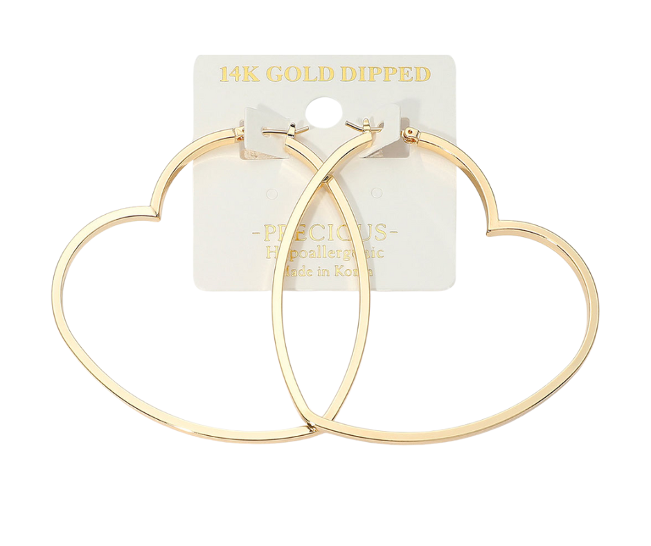 Sweet and stylish hoops crafted with a heart-shaped design. Dipped in gold for lasting shine and hypoallergenic for comfortable wear. Also available in white gold dipped.