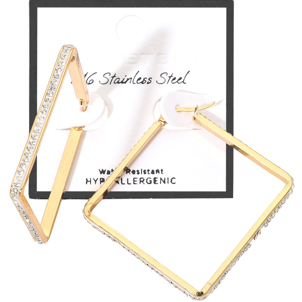 These chic square hoop earrings feature a sleek stainless steel design adorned with sparkling rhinestones. Lightweight and comfortable, the secure pin catch ensures they stay in place while adding a modern touch of shimmer to any outfit.