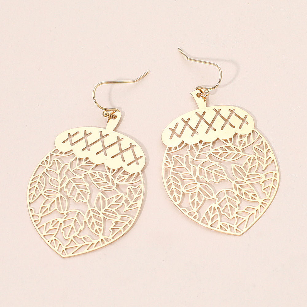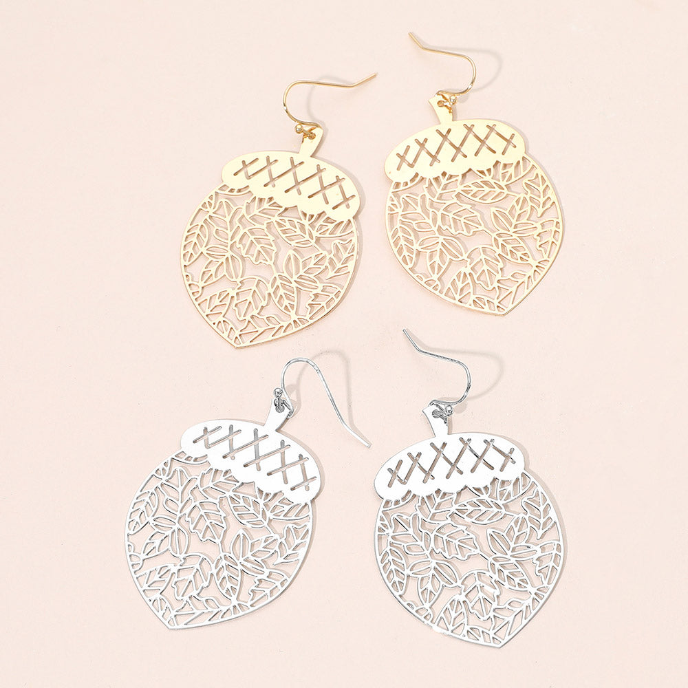 Bring a touch of nature-inspired charm to your look with these leafy acorn cutout dangle earrings. Designed with delicate leaf and acorn details, they offer a lightweight feel and beautiful movement. Perfect for adding a seasonal or earthy accent to any outfit.