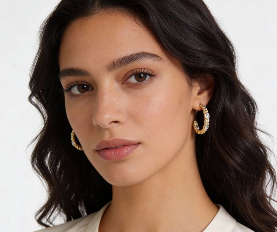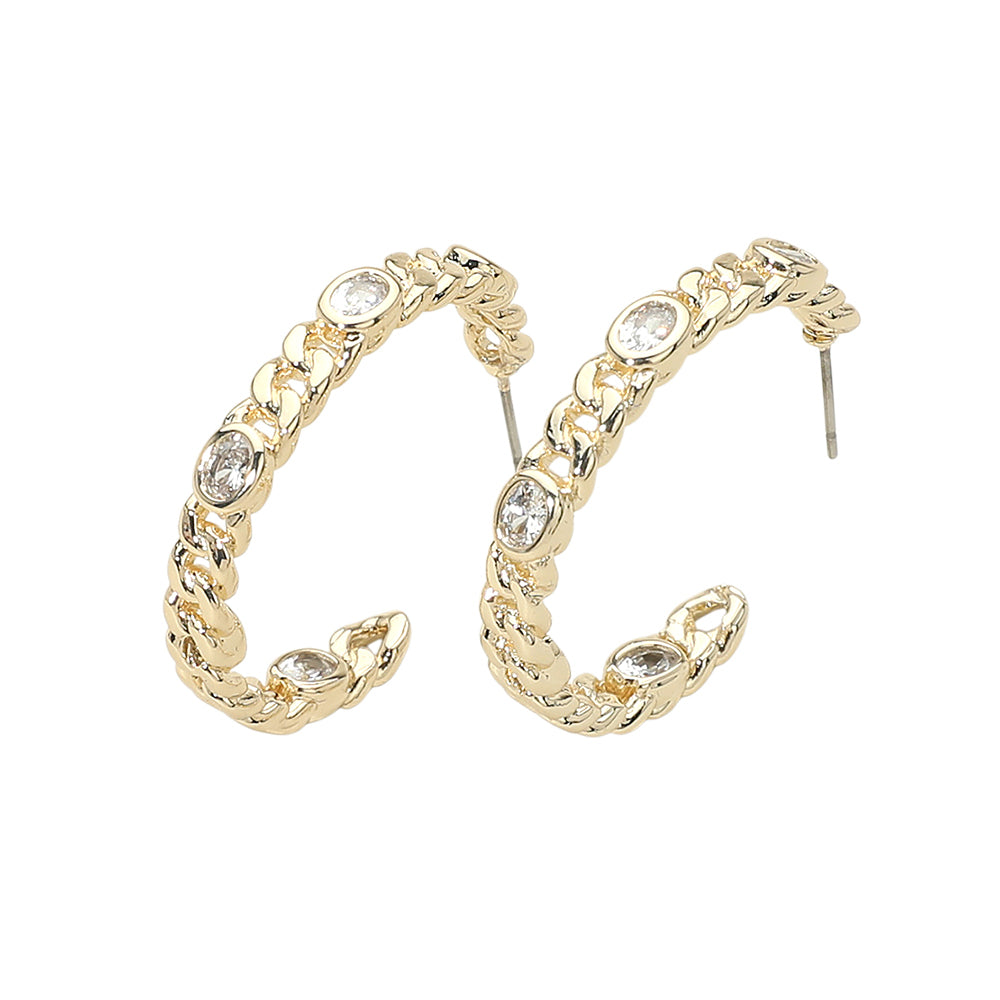 Elegant hoop earrings featuring oval cubic zirconia stone accents and delicate chain detailing. Finished in 14K gold plating, they offer a polished look with just the right amount of sparkle, perfect for everyday wear or special occasions.