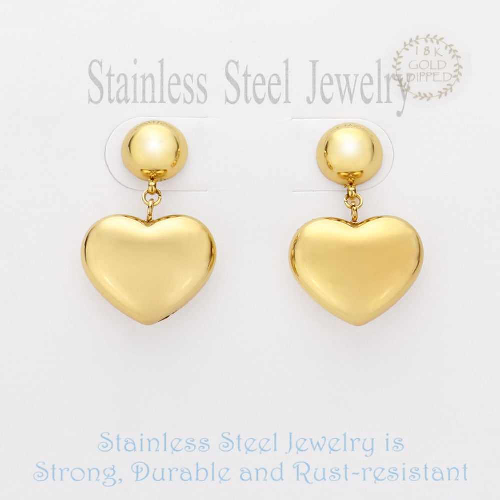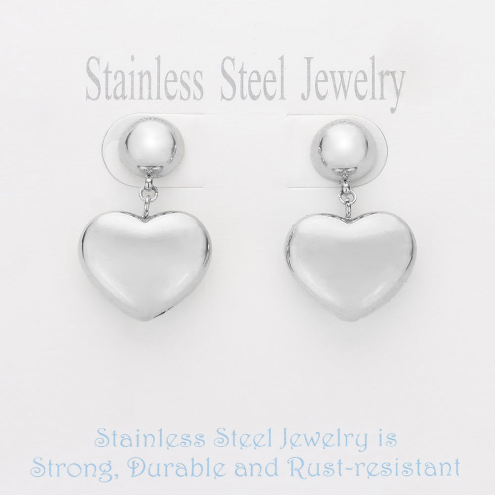 Charming and stylish, these stainless steel heart dangle earrings add a playful touch to any look. Designed with a smooth finish and lightweight feel for all-day comfort. Available in gold or silver.