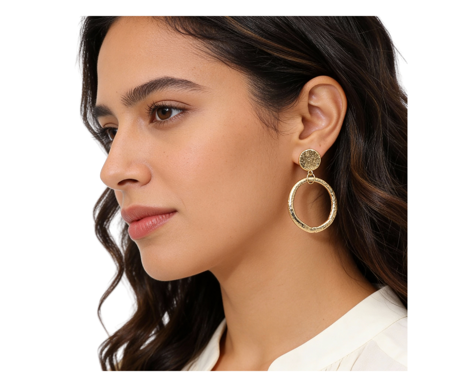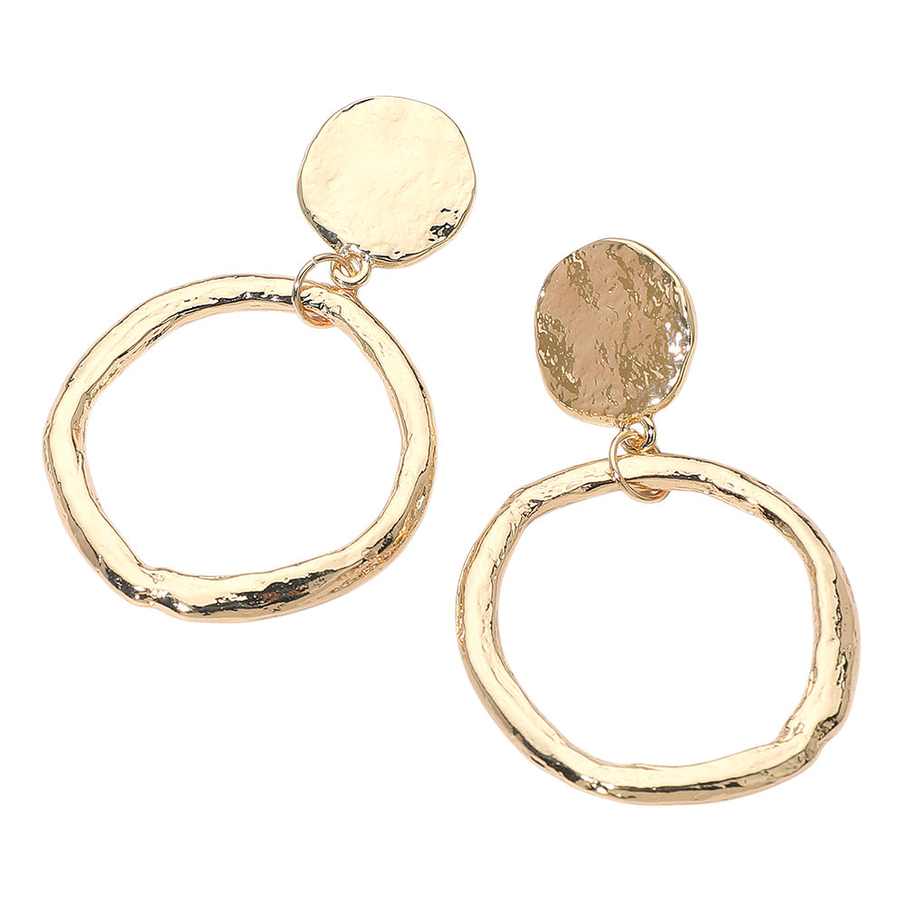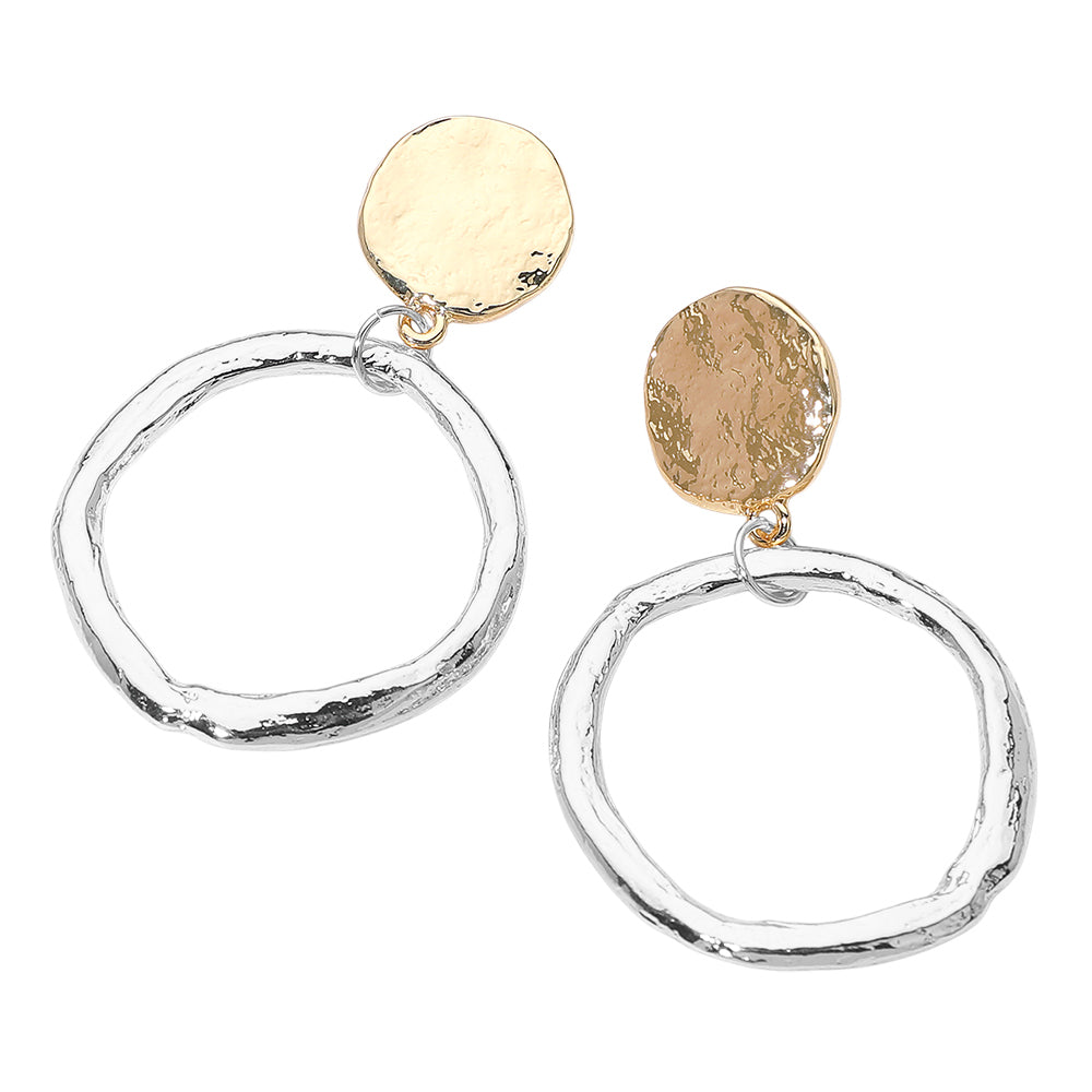 These stylish dangle earrings feature a hammered metal ring design that adds texture and shine. Lightweight with a modern look, they’re easy to wear and perfect for pairing with both casual and dressy outfits.
