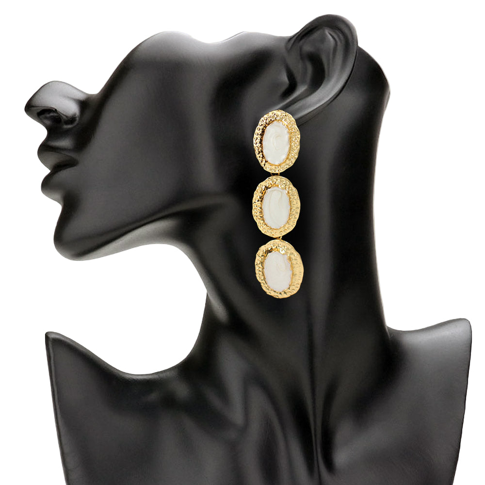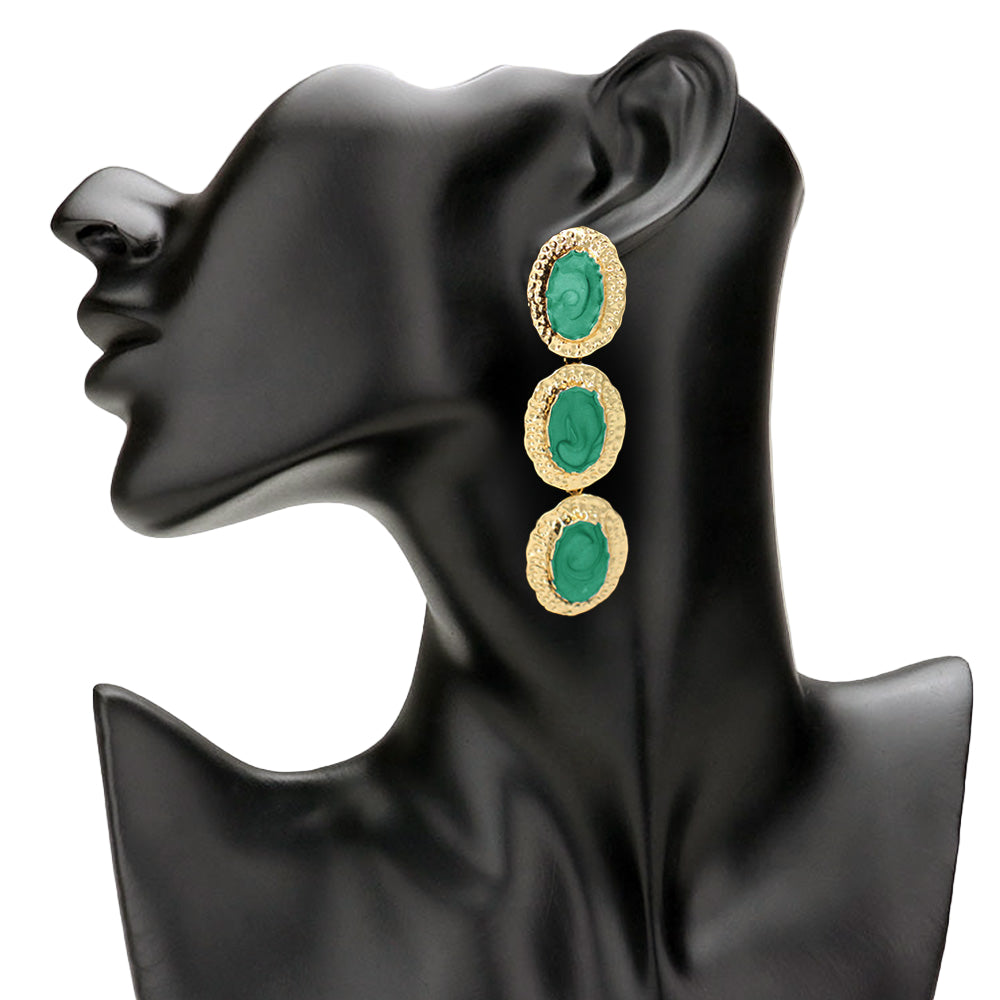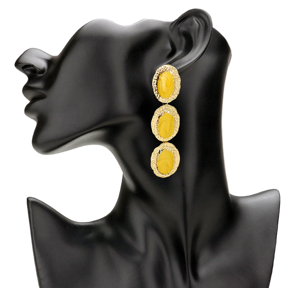 The triple textured frame enamel oval plate drop earrings feature a mix of textures and enamel accents for a bold, stylish look. Their unique layered design adds dimension and charm, making them a standout accessory.