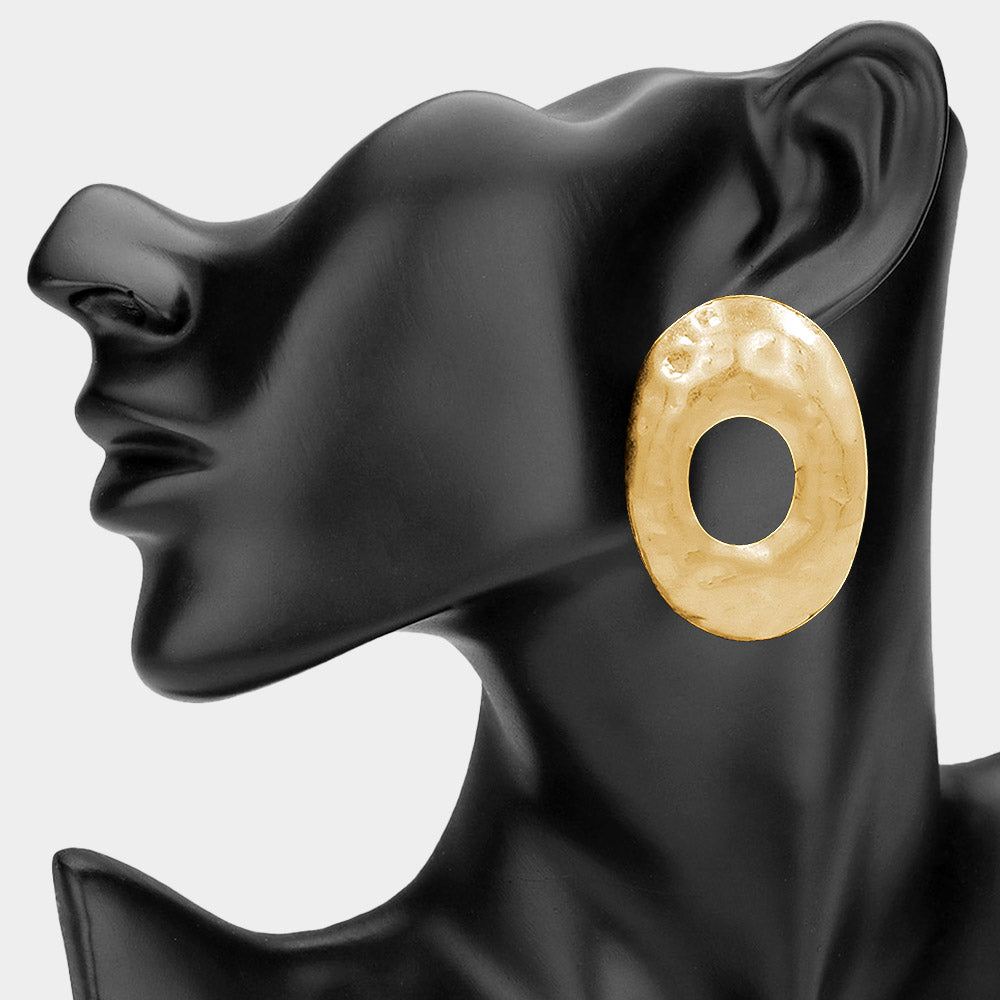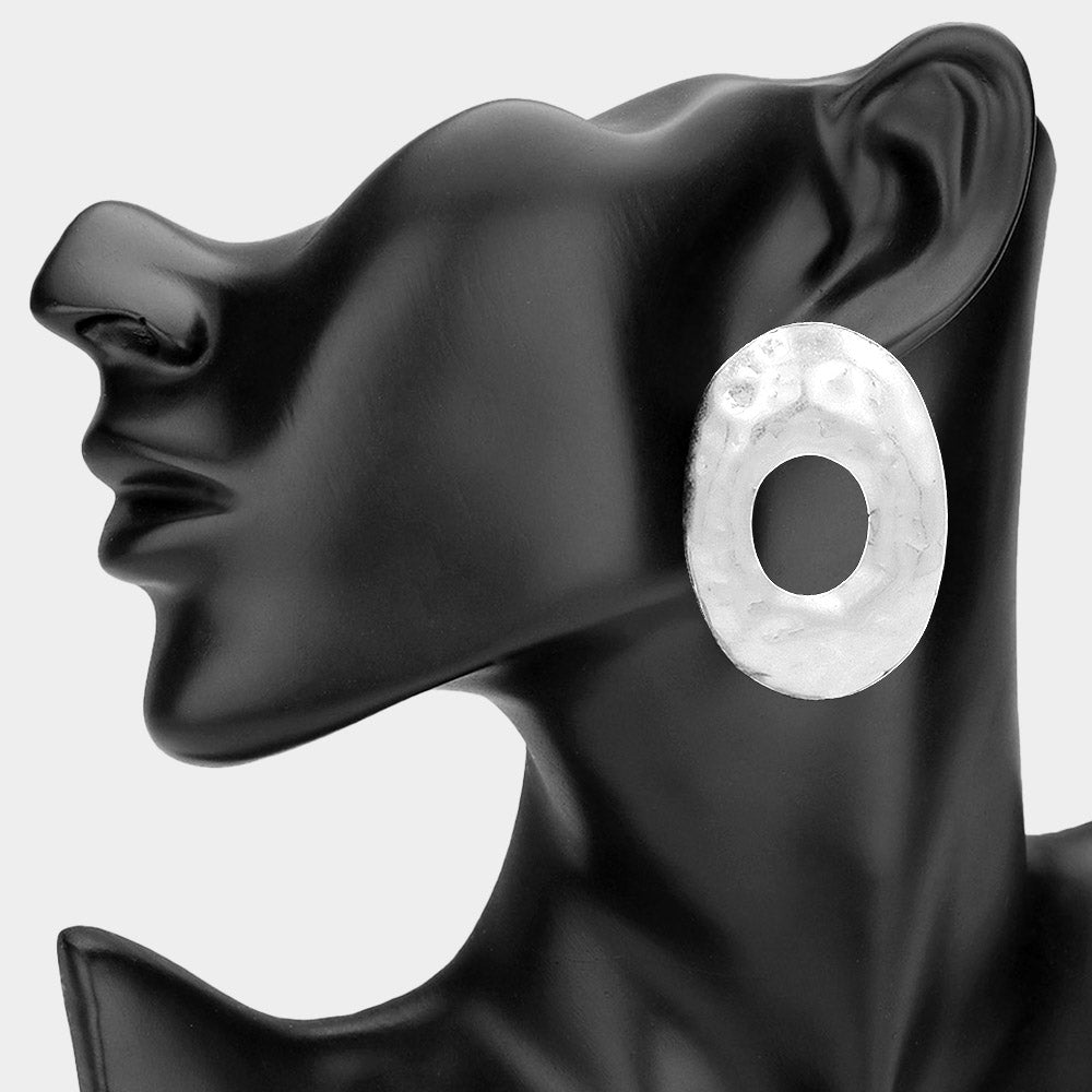 Make a striking statement with these bold hammered metal oval earrings. Featuring an oversized oval shape with a textured hammered finish, these earrings add modern dimension and sculptural style to any outfit. Perfect for everyday wear or elevating your look for special occasions.