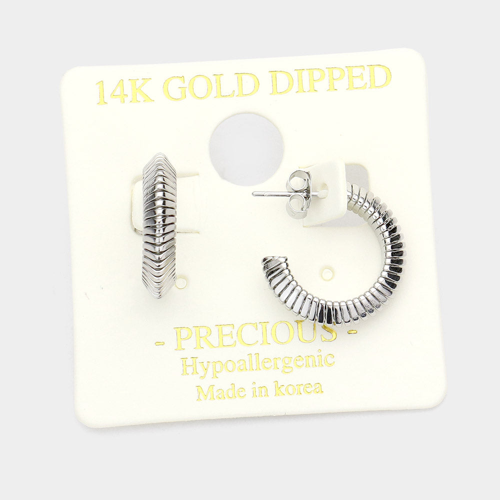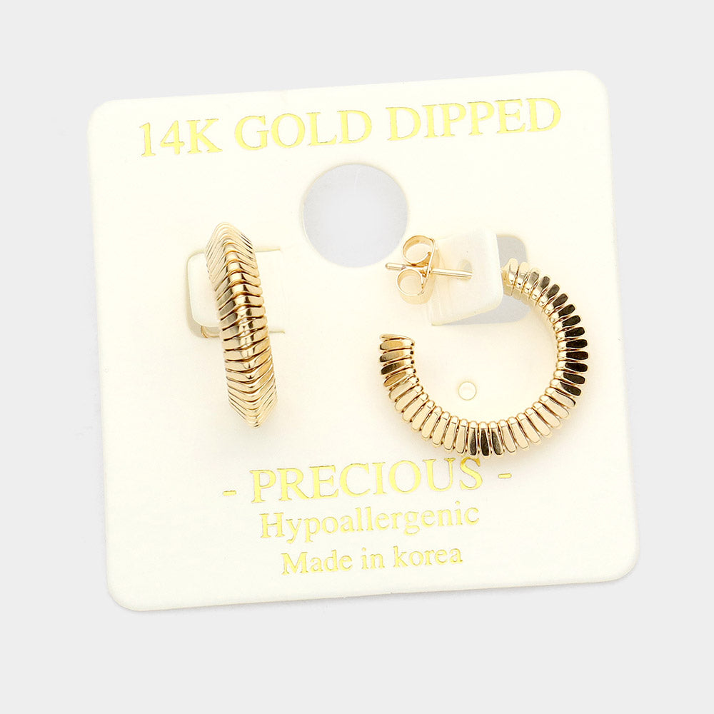 14K Gold Dipped Textured Metal Half Hoop Earrings featuring a chic, modern design. Also available in white gold dipped for a versatile look. Perfect for adding subtle style to any outfit.
