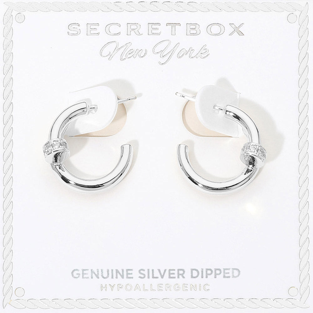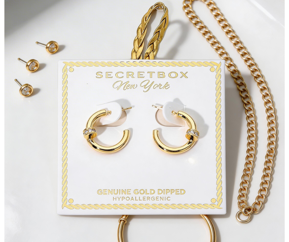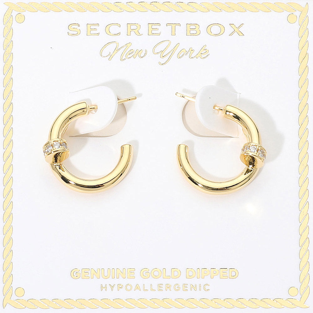 These gold dipped mini nail hoop earrings feature a sleek curved design accented with stone pavé detail for a subtle touch of shine. The modern silhouette adds a clean, edgy look while keeping it refined. Also available in white gold dipped for versatile styling.
