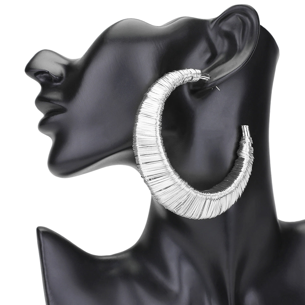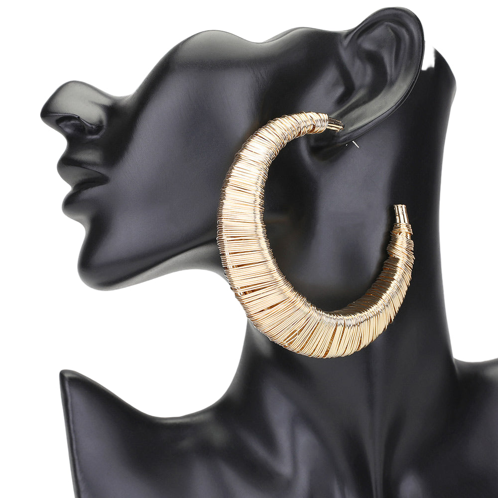 Oversized metal wire wrapped hoop earrings featuring a detailed wrapped design. Lightweight, stylish, and easy to wear. Available in gold or silver.