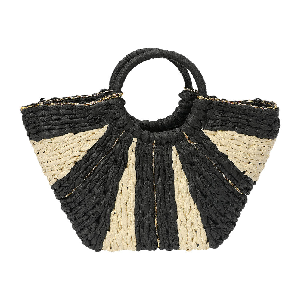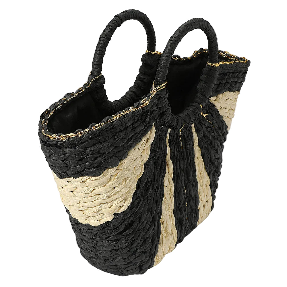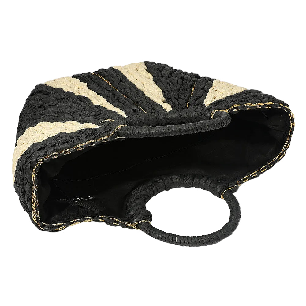 A woven raffia tote bag featuring round handles for a natural, easygoing look. Lightweight and spacious, perfect for everyday use or warm-weather outings.