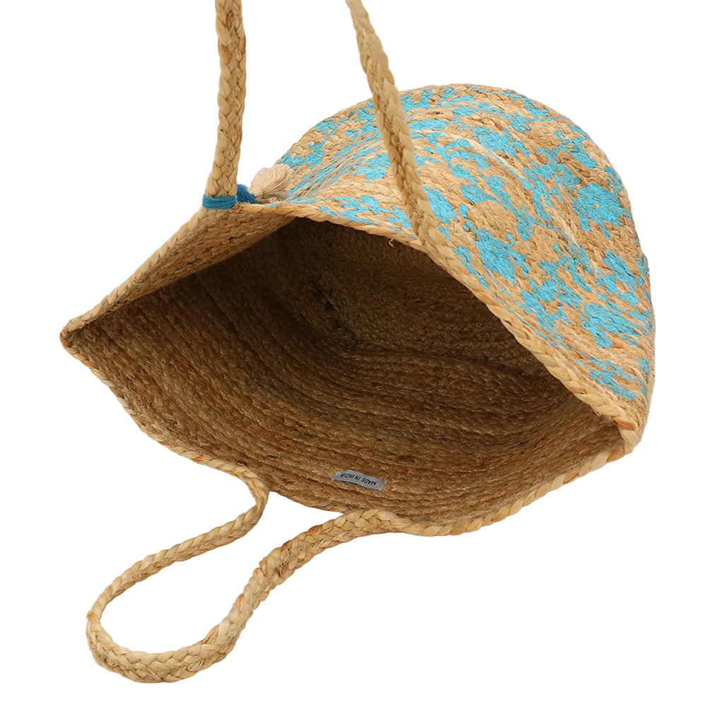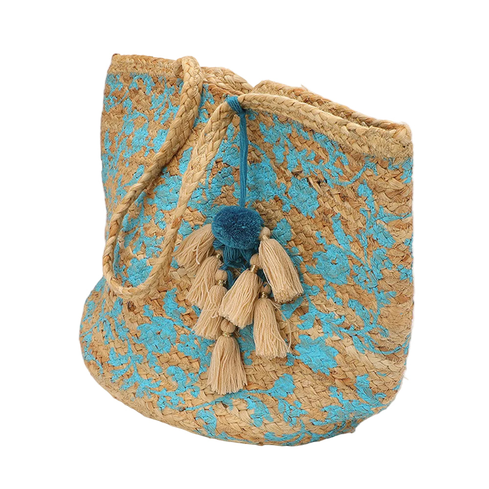 A woven straw tote bag featuring a colorful splash print and playful pom and tassel accents. Lightweight and roomy, perfect for carrying everyday essentials. A fun, vibrant accessory for beach days, casual outings, or summer adventures.