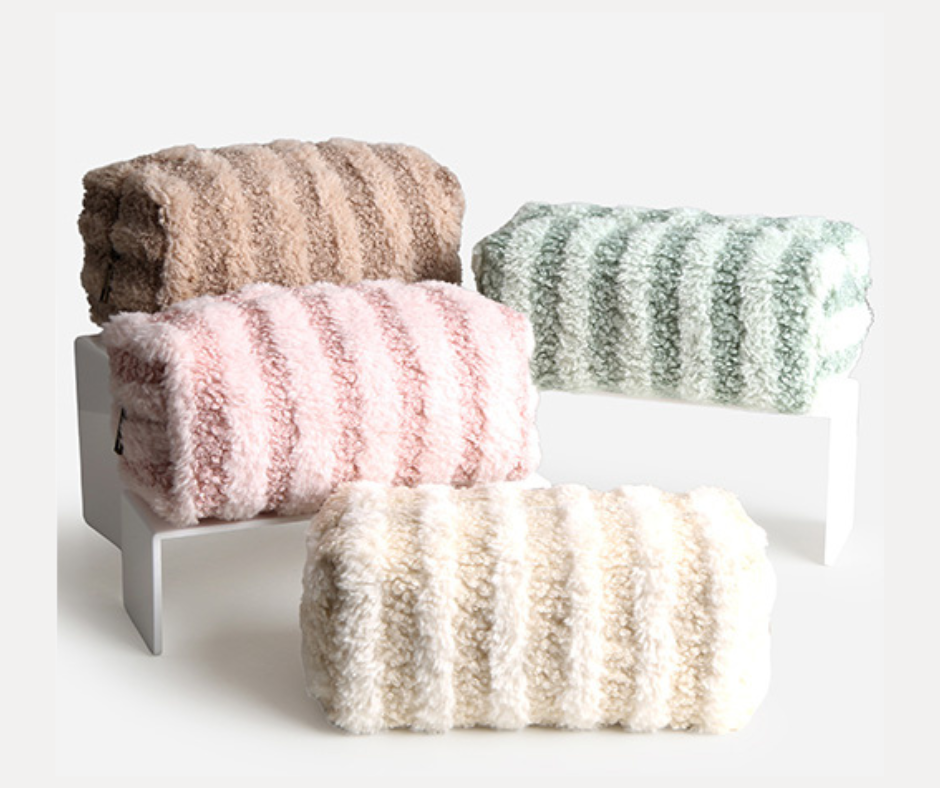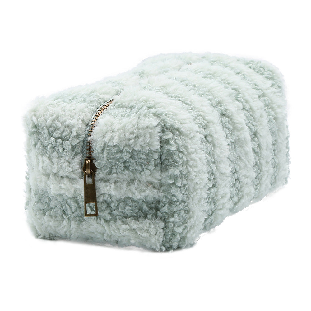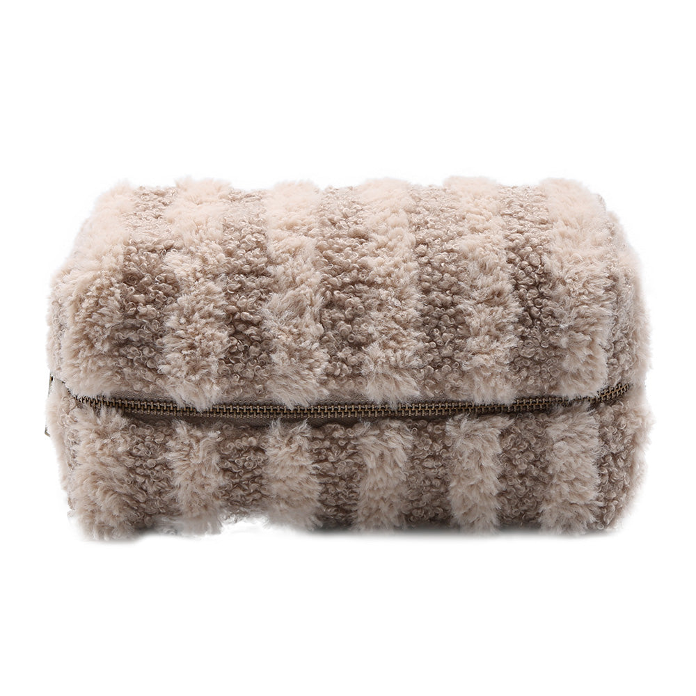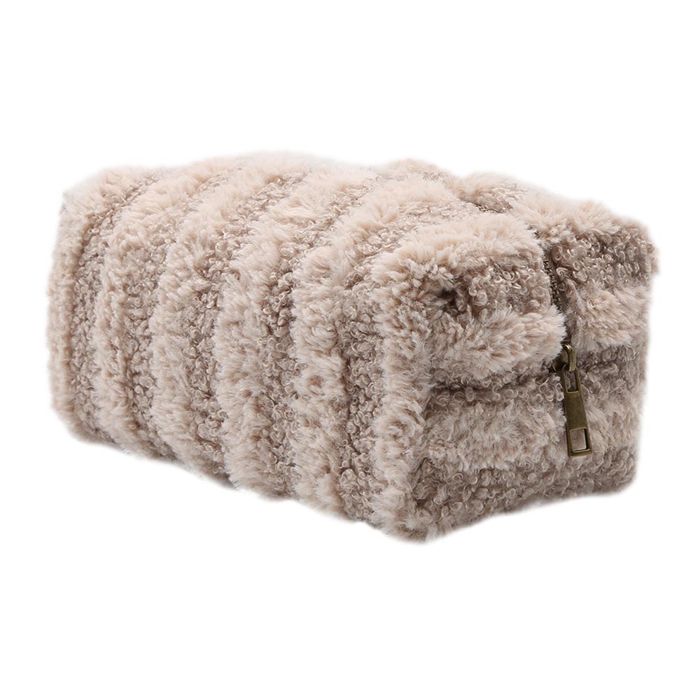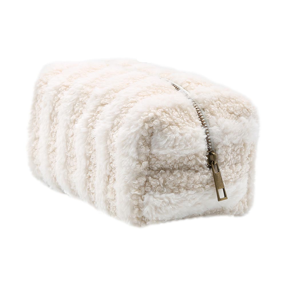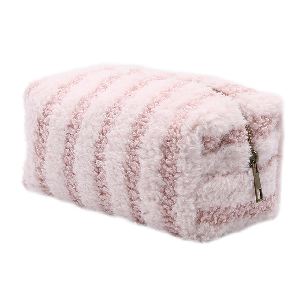 Stripe sherpa pouch bag featuring a soft, cozy textured design with a smooth zipper closure. Great for makeup, small essentials, or other accessories, making it a convenient and stylish on-the-go organizer.