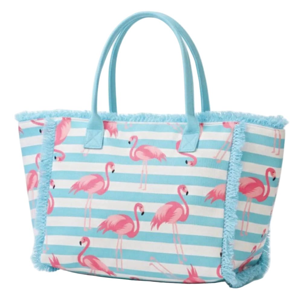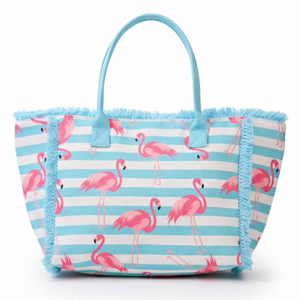 Add a fun, tropical touch to your look with this Flamingo Pattern Stripe Fringe Trim Shoulder Tote Bag. Featuring playful flamingo prints, classic stripes, and fringe trim detail, it’s the perfect blend of vibrant and chic. Spacious and stylish, it’s ideal for beach days, weekend outings, or everyday summer wear.