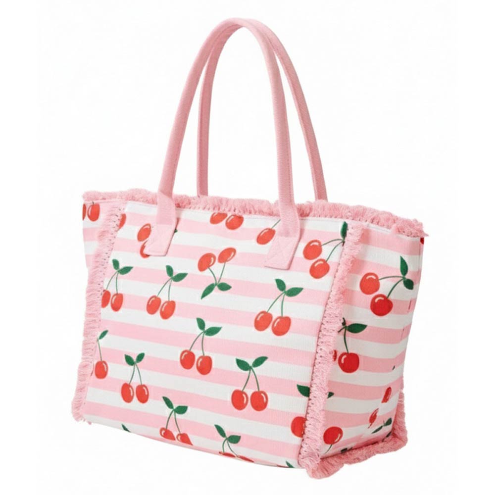 Add a sweet pop of style with this Cherry Pattern Stripe Fringe Trim Shoulder Tote Bag. Featuring playful cherry prints, classic stripe detailing, and flirty fringe trim, it blends charm with effortless chic. Spacious and easy to carry, it’s perfect for sunny outings, weekend errands, or adding a fun twist to your everyday look.