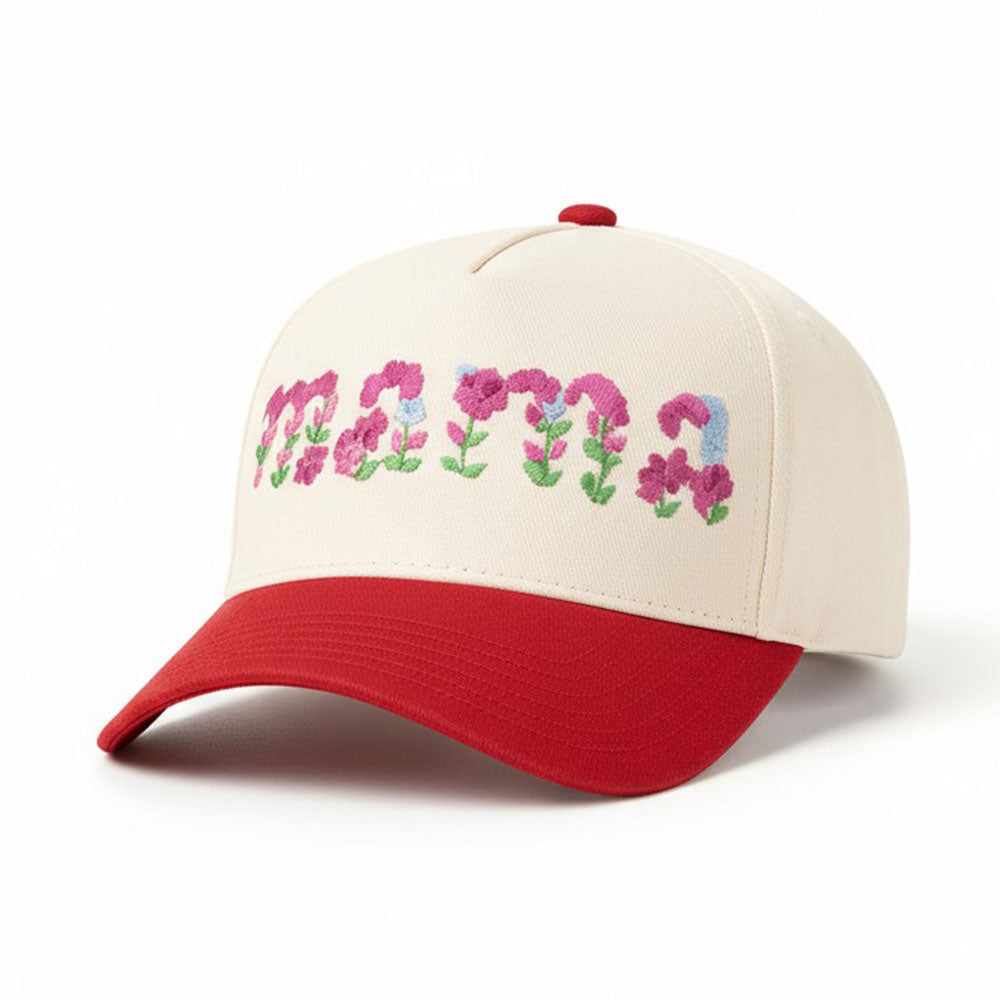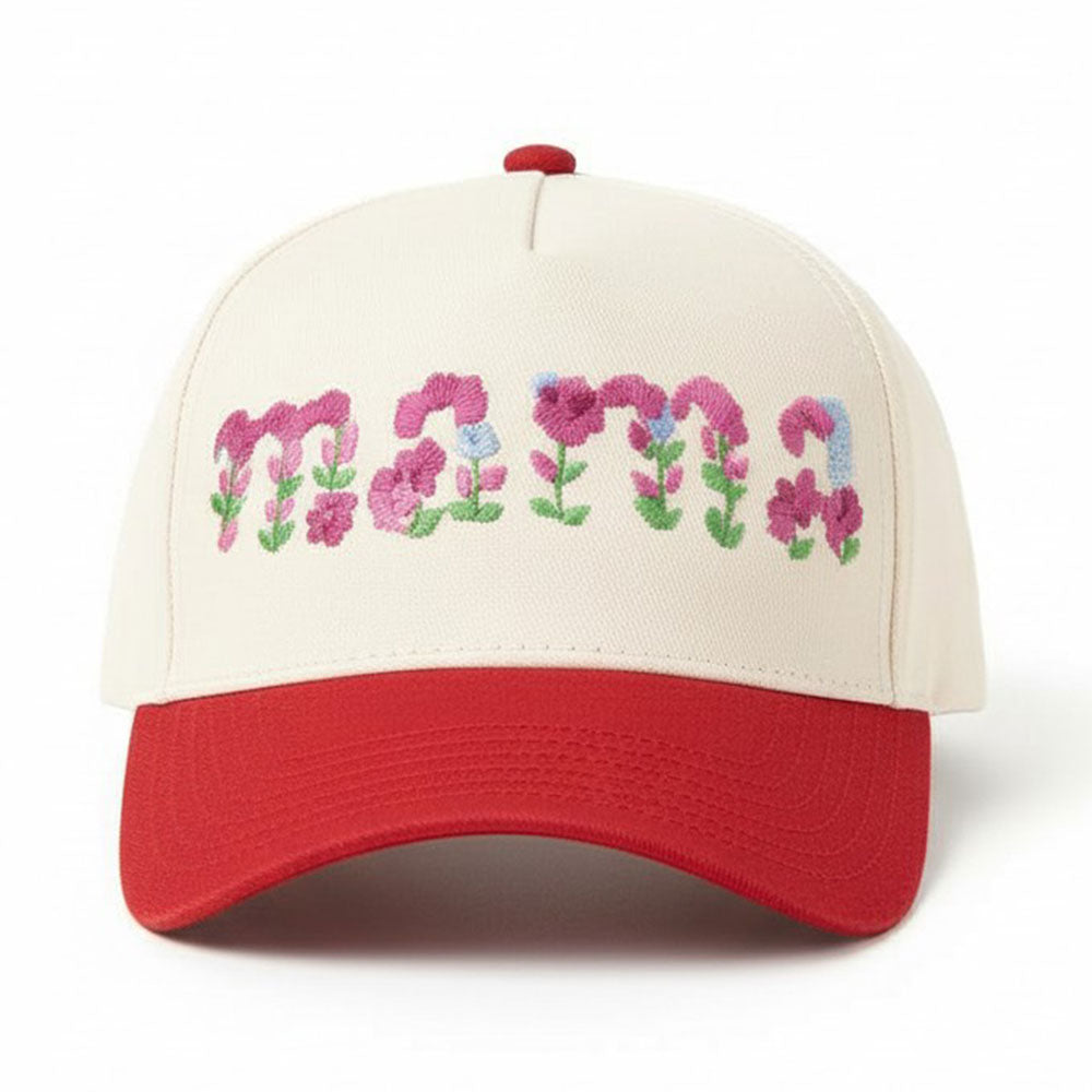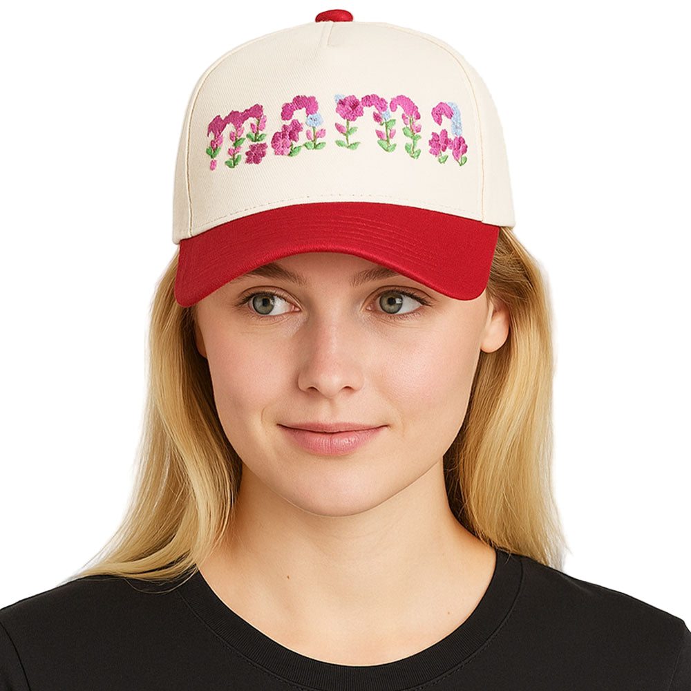 A stylish and comfortable five-panel canvas baseball cap featuring embroidered floral accents and “MAMA” lettering. Perfect for casual outings, adding a personalized touch, or showing off your mom pride in a fashionable way.