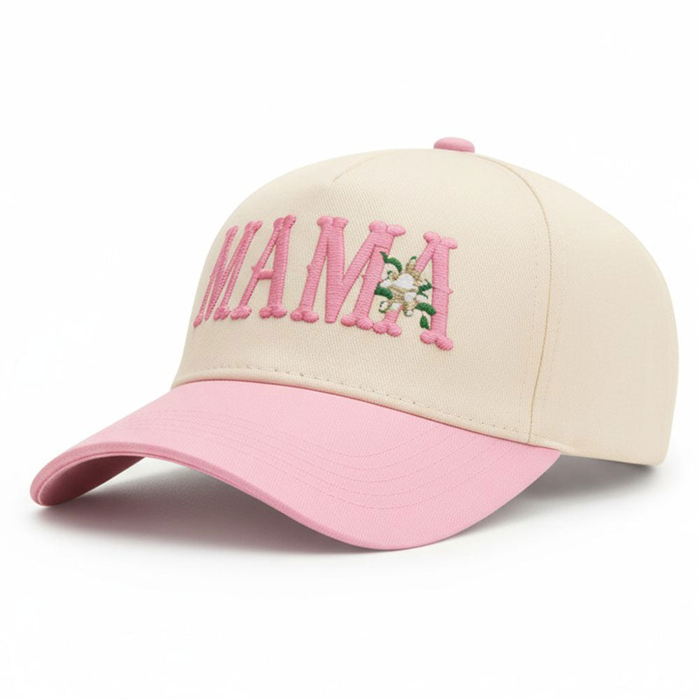 Floral MAMA embroidered five-panel canvas baseball cap featuring detailed floral stitching and bold “MAMA” lettering. Comfortable and stylish, perfect for casual wear or adding a fun, personalized touch to any outfit.