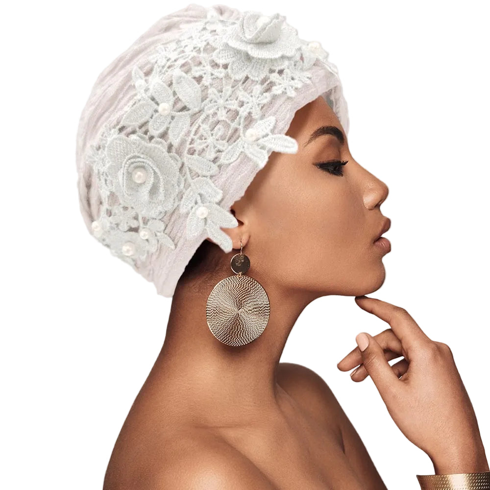 This floral lace turban hair wrap is accented with pearl embellishments for a soft, feminine look. Designed to be comfortable and easy to wear with a secure fit. A stylish accessory perfect for dressing up everyday hairstyles or special occasions.