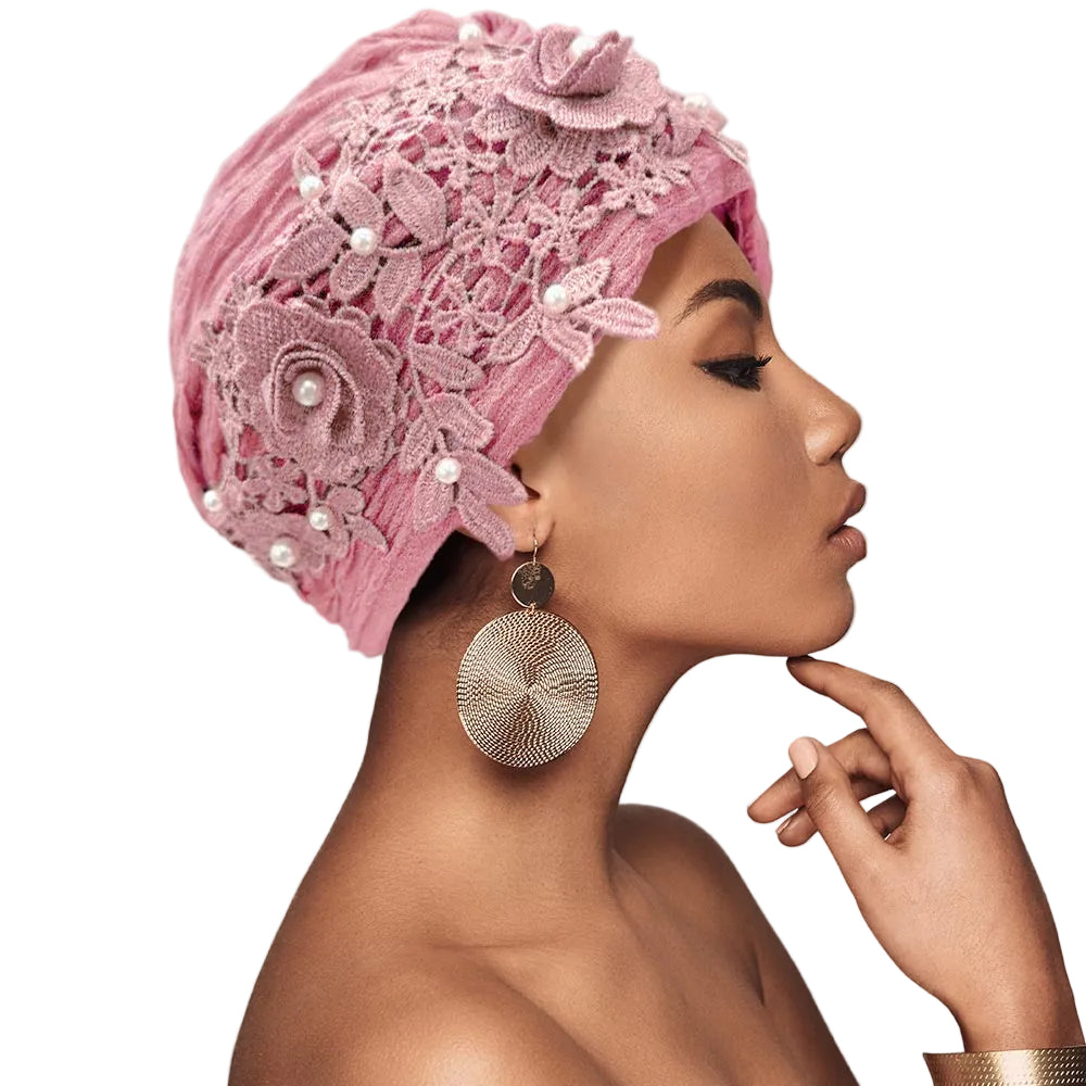 This floral lace turban hair wrap is accented with pearl embellishments for a soft, feminine look. Designed to be comfortable and easy to wear with a secure fit. A stylish accessory perfect for dressing up everyday hairstyles or special occasions.