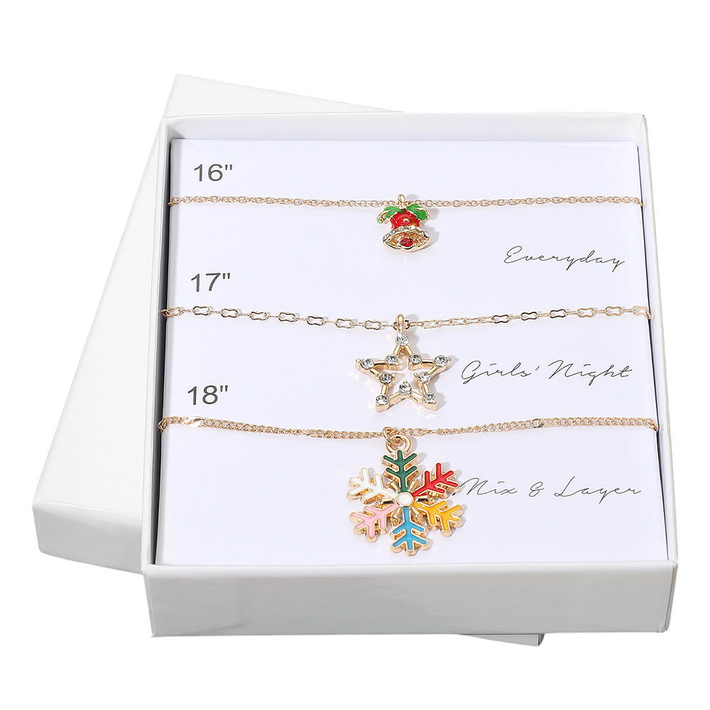 Celebrate the season with this 3 pcs christmas bell, star, and snowflake pendant necklace set. Each festive pendant sparkles with holiday cheer, from the joyful bell to the twinkling star and frosty snowflake. Perfect for adding a merry touch to your holiday outfits or gifting with festive spirit.