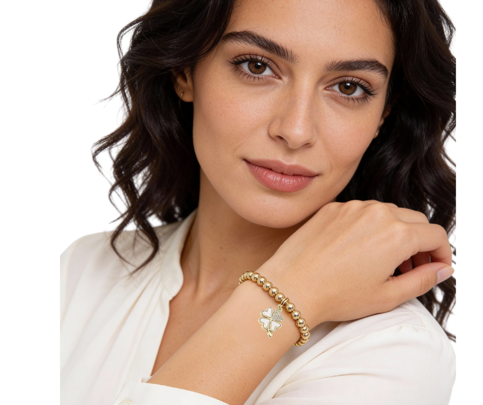 Features a polished stainless steel beaded stretch design accented with a stone-paved mother of pearl clover charm. The flexible stretch fit allows for easy, comfortable wear, making it ideal for everyday styling or layering with other bracelets. Available in gold or silver.