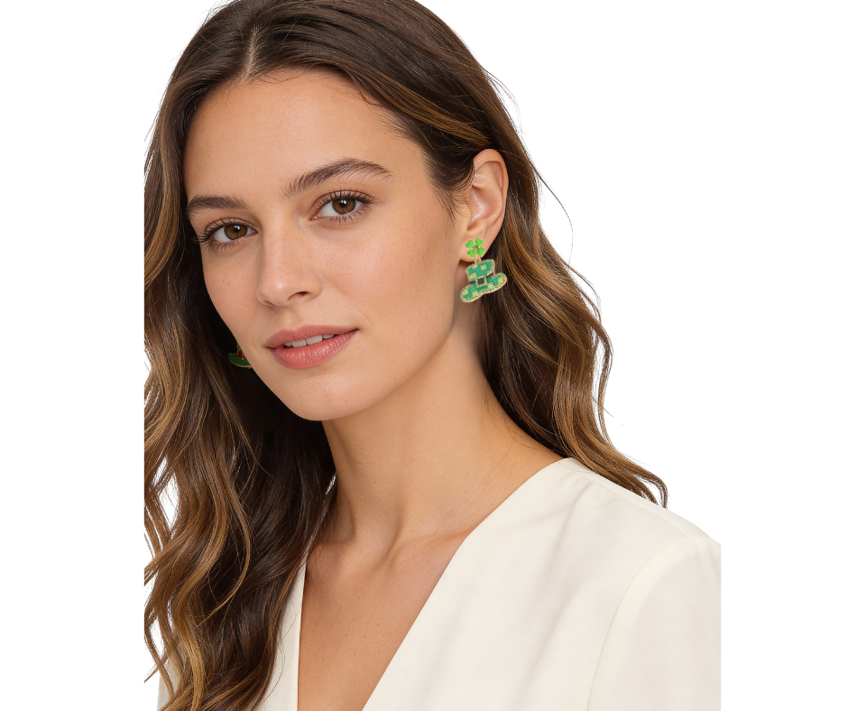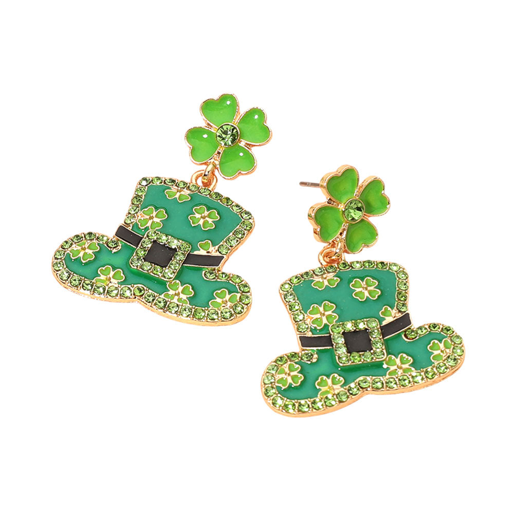 These St. Patrick’s Day shamrock hat dangle earrings feature festive hat accents paired with classic shamrock details. Designed with lightweight movement for comfortable, all-day wear. A fun and charming statement piece perfect for celebrating in style.