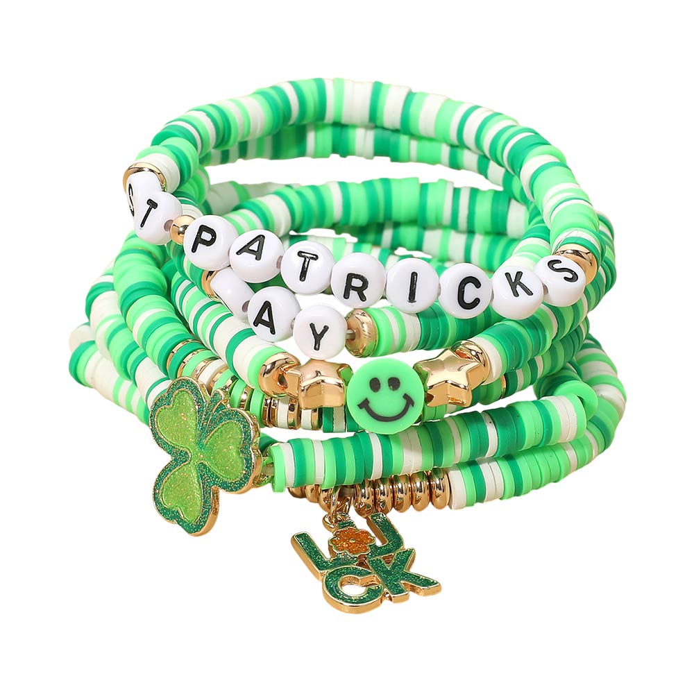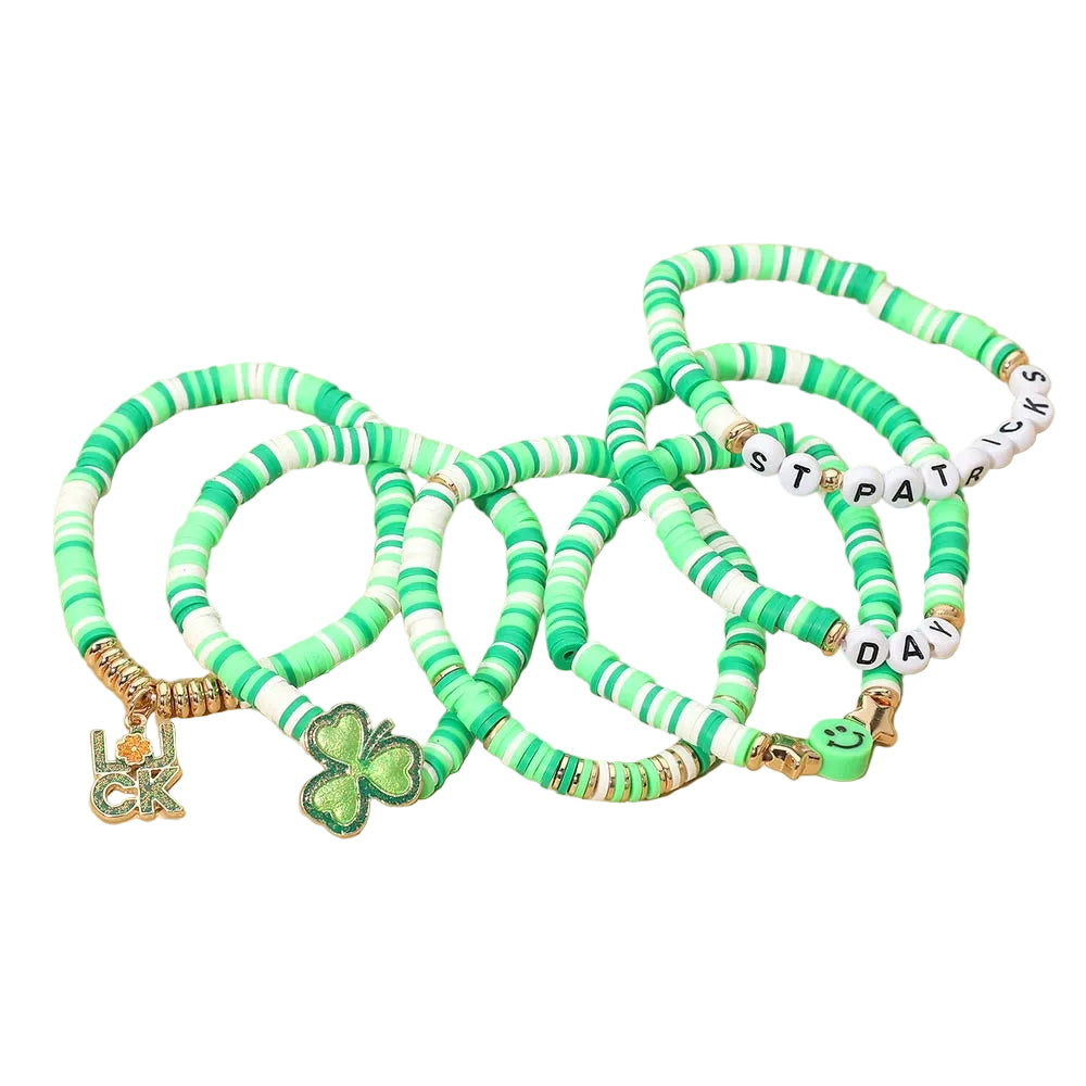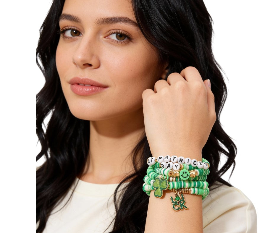 This 6-piece St. Patrick’s Day bracelet set features LUCK charms, smiley faces, and clover accents paired with colorful heishi beads. Stretchable and comfortable, they’re easy to layer or wear individually. A fun and festive accessory set perfect for celebrating in cheerful style.
