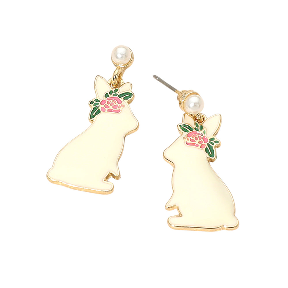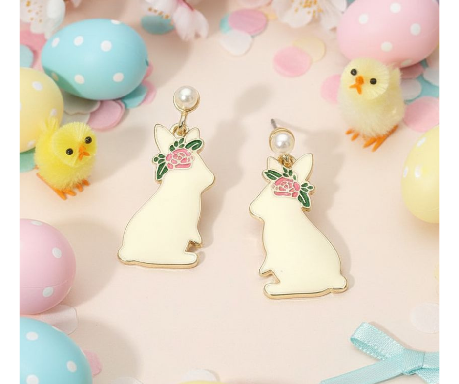 These drop dangle earrings feature a charming bunny design accented with floral enamel details and a gold dipped finish. A playful yet stylish pair perfect for adding a festive, spring-inspired touch to your look.