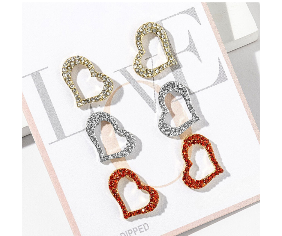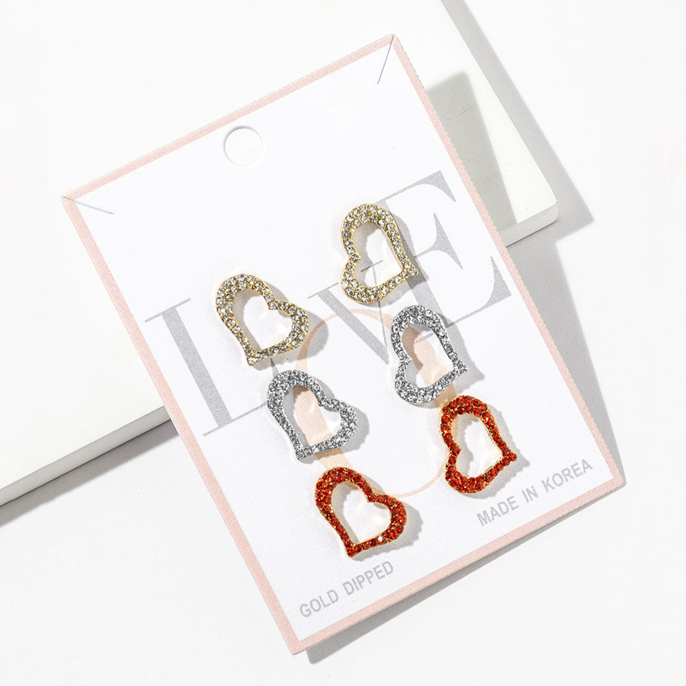 A versatile earring set featuring three pairs of open heart studs with rhinestone paving for added sparkle. Gold dipped with a smooth finish, these studs are easy to wear and perfect for mixing and matching or everyday styling.