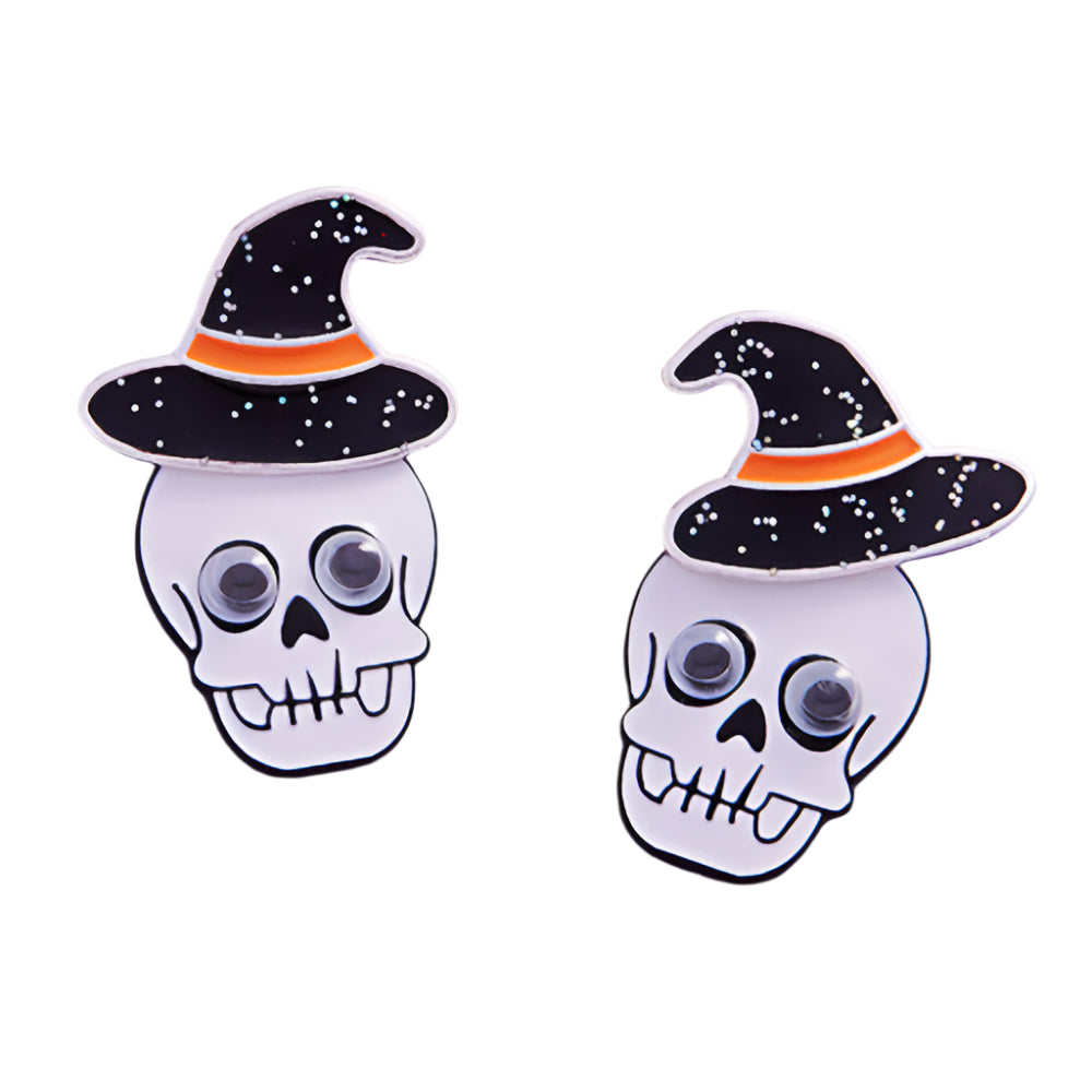 These playful enamel earrings feature smiling skull heads topped with tiny witch hats, combining spooky and cute in one fun design. A perfect Halloween accessory to add charm and character to your festive look.