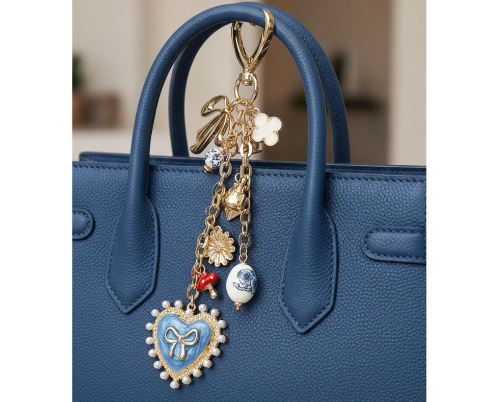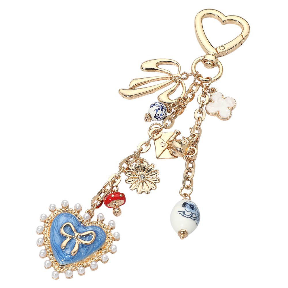 A whimsical and playful keychain or bag charm featuring multiple charms—including pearl-accented bows, hearts, quatrefoil flowers, mushrooms, and envelopes—connected with an embellished design. Perfect for hanging on the tab of a zipper, keys, handbags, or totes to add a fun, eye-catching touch.