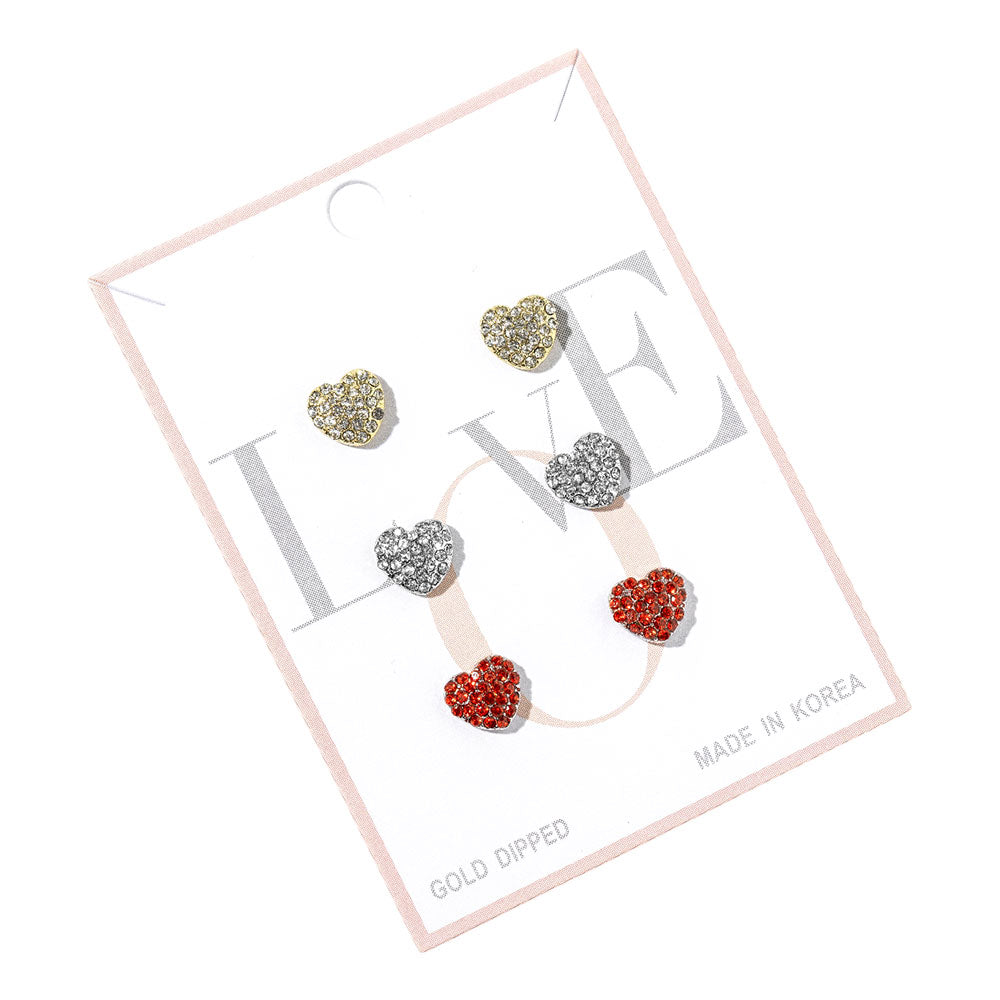 A cute and versatile set featuring three pairs of mini heart studs, each accented with sparkling rhinestones and gold dipped for a polished look. Lightweight and perfect for everyday wear, layering, or mixing and matching.