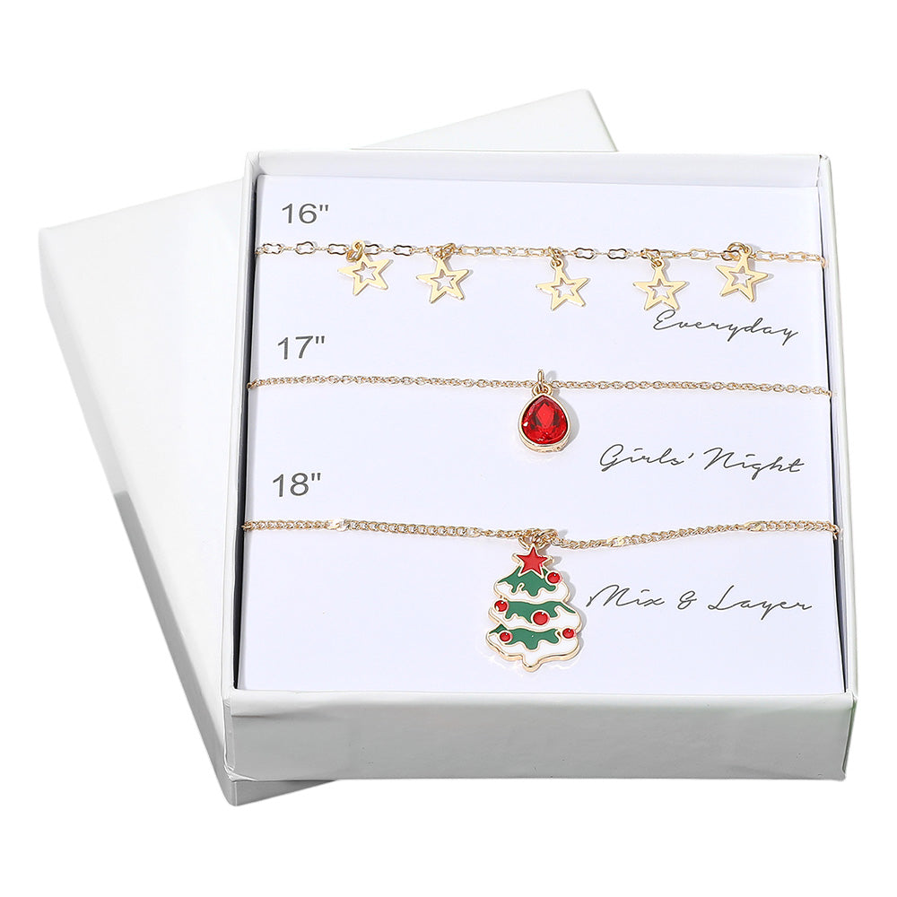 Celebrate the season with this 3 pcs star charm, teardrop stone, and christmas tree pendant necklace set. Each pendant brings festive sparkle — from the shining star to the twinkling stone and the joyful tree. A perfect touch for holiday gatherings or as a cheerful gift.
