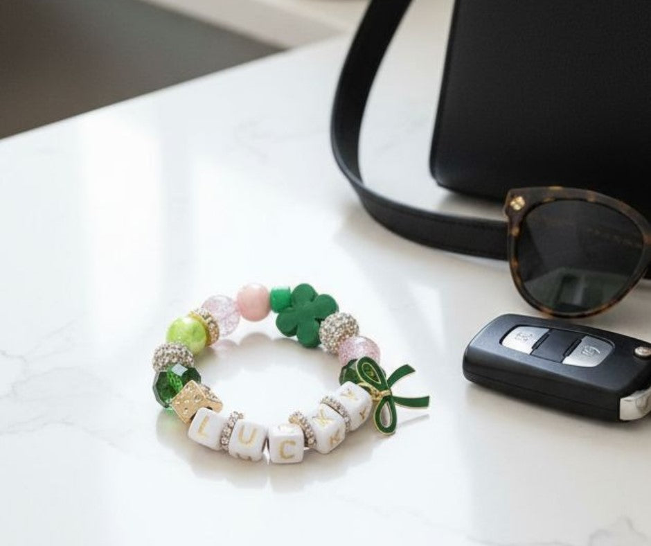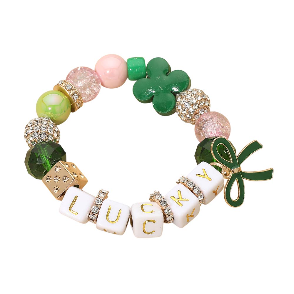 Celebrate St. Patrick’s Day with this festive stretch bracelet featuring a bow, shamrock, and clover charms. Comfortable and easy to wear, it’s perfect for layering or gifting.