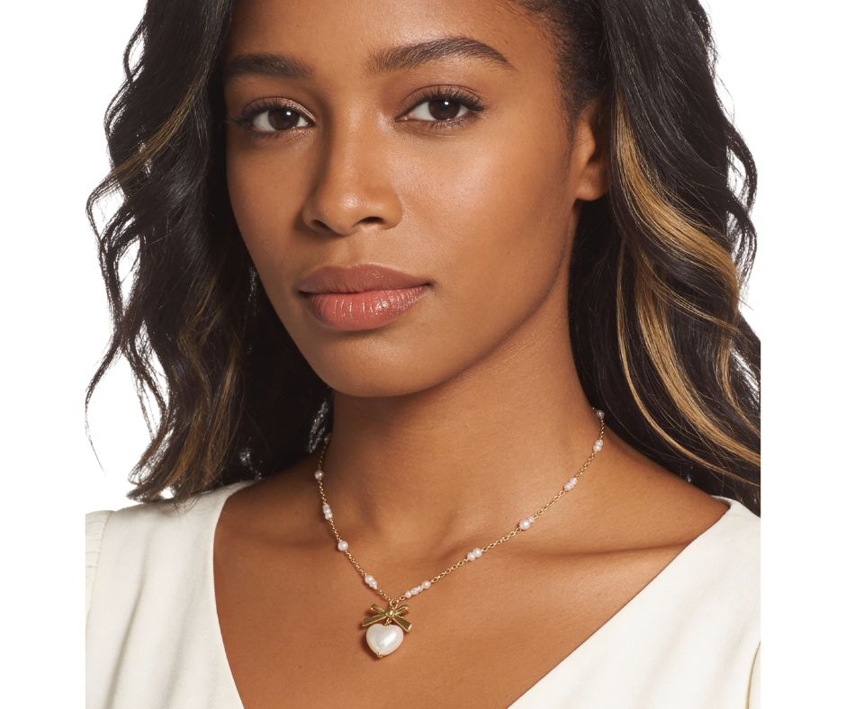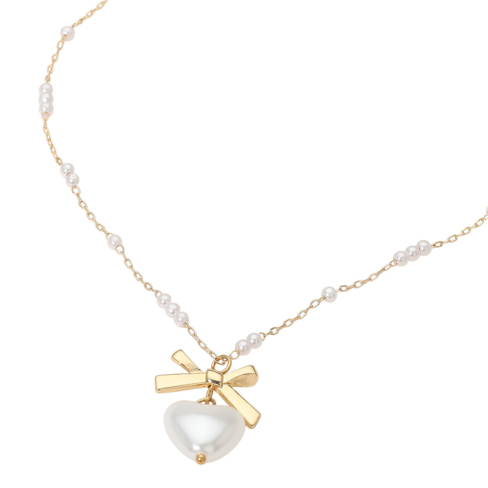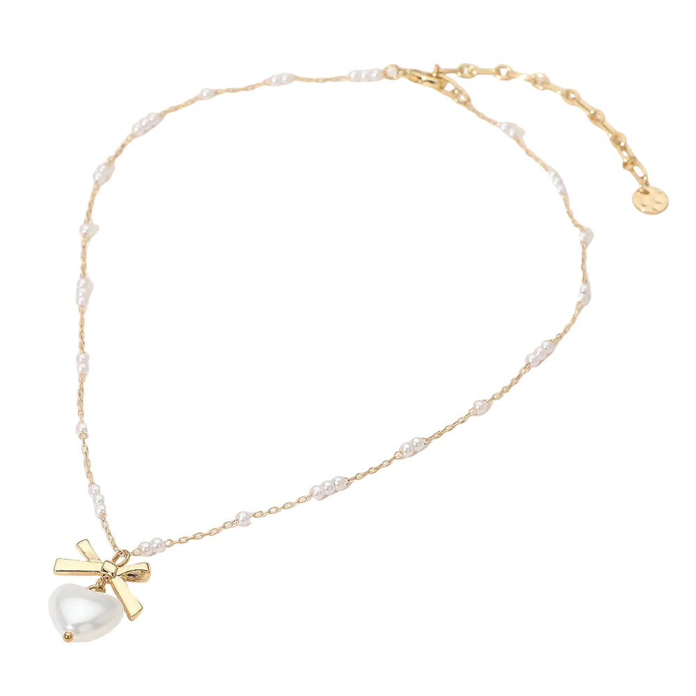 A charming station necklace featuring pearl beads and a heart pendant accented with a bow detail. Designed with a delicate silhouette and lightweight feel, it adds a soft, polished touch to both everyday outfits and dressier looks, and layers beautifully with other necklaces.