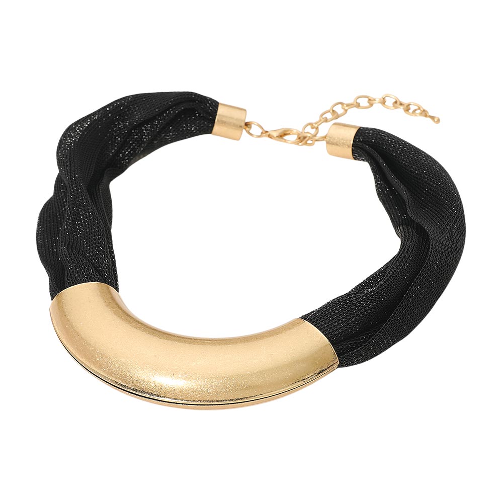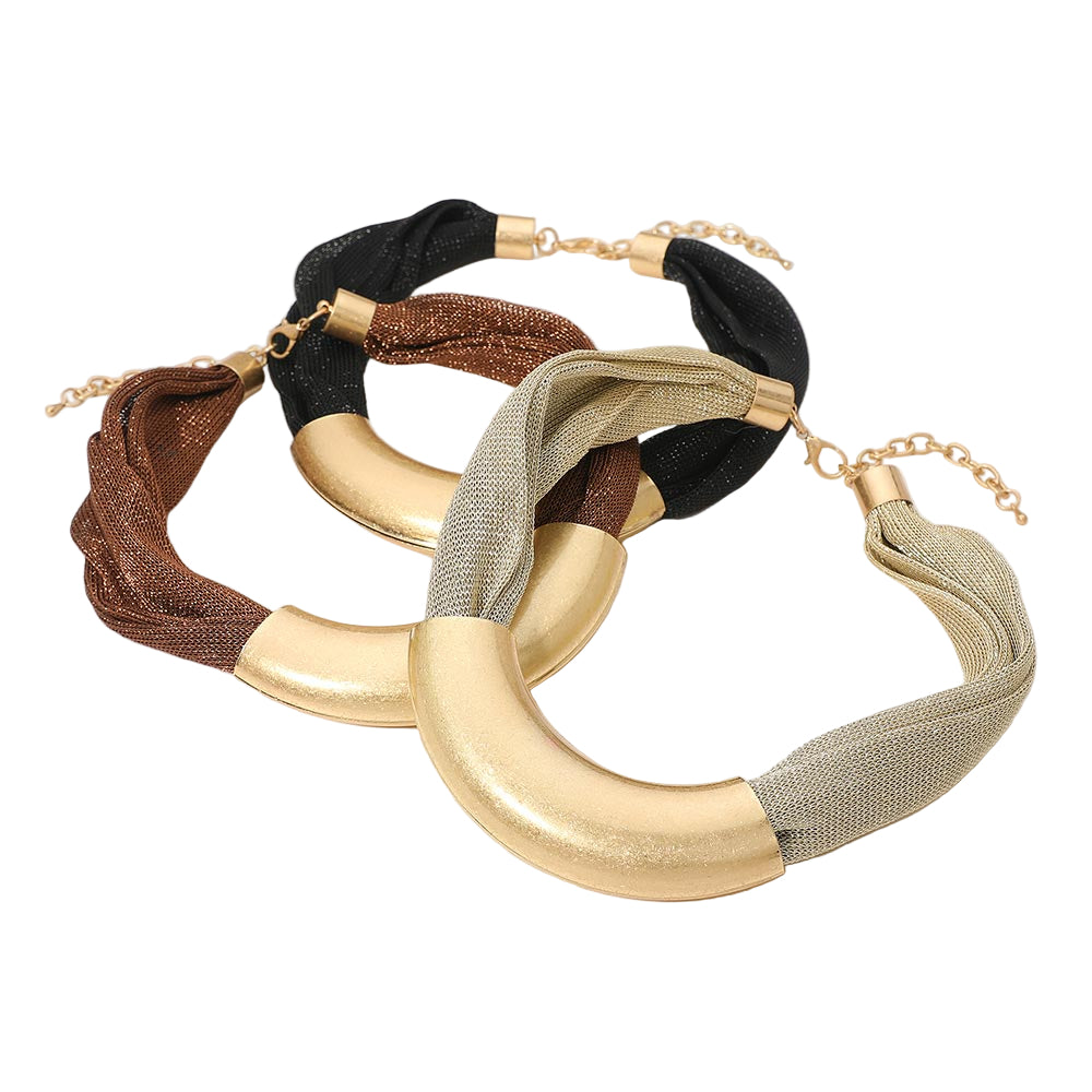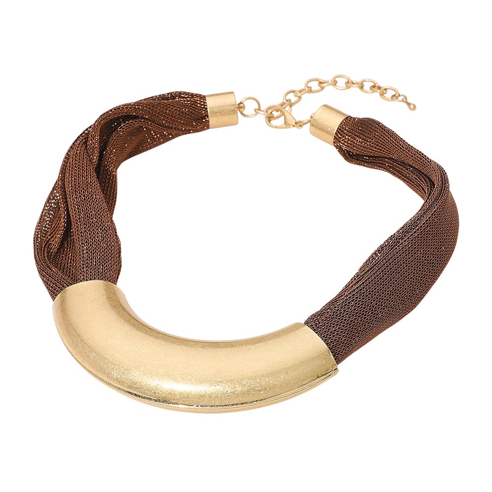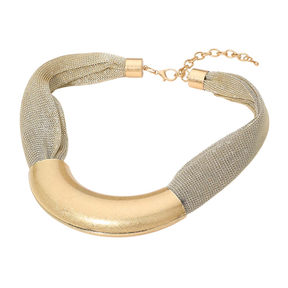 Curved metal plated accent mesh chain statement necklace featuring a flexible mesh band and a smooth curved metal plate at the center. Its bold yet clean design makes it an eye-catching piece that instantly adds a polished, modern touch to your look.
