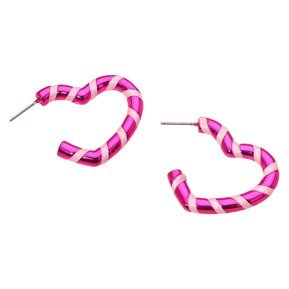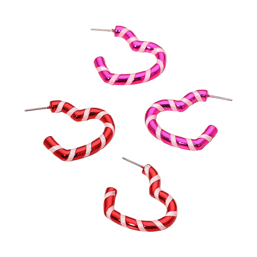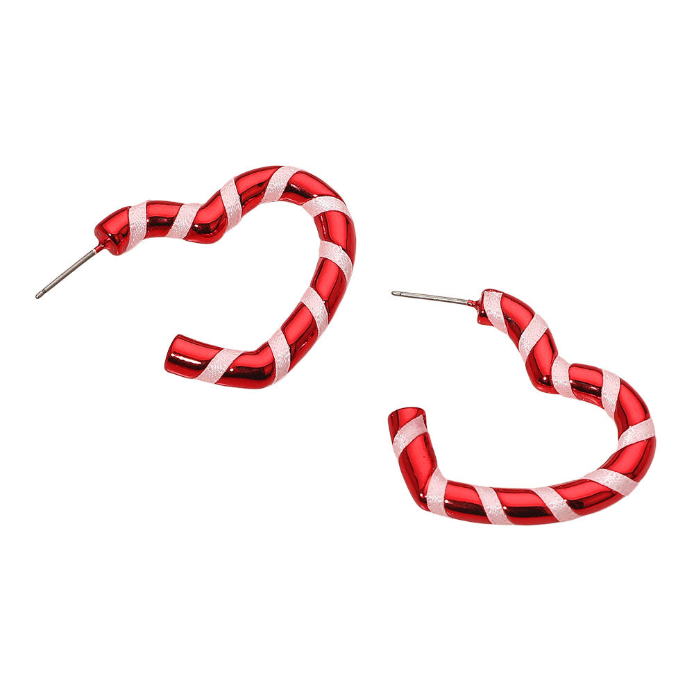These playful hoop earrings feature an open heart shape with a shiny metallic candy cane pattern, giving them a fun and festive look. Lightweight and easy to wear, they’re a cheerful holiday accent that pairs perfectly with seasonal outfits.
