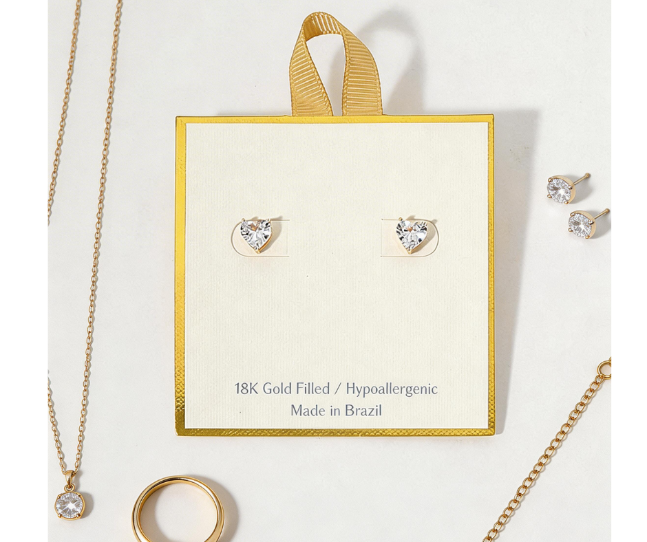 18k gold filled hypoallergenic heart cubic zirconia stud earrings featuring a classic heart shape adorned with sparkling cubic zirconia for a timeless, elegant look. Lightweight and comfortable for all-day wear, these studs are perfect for everyday styling or special occasions.