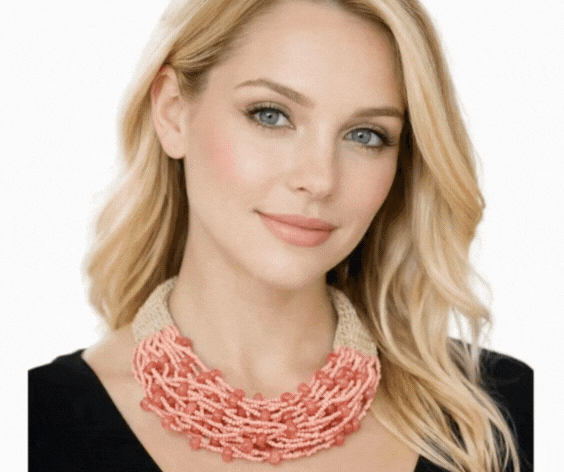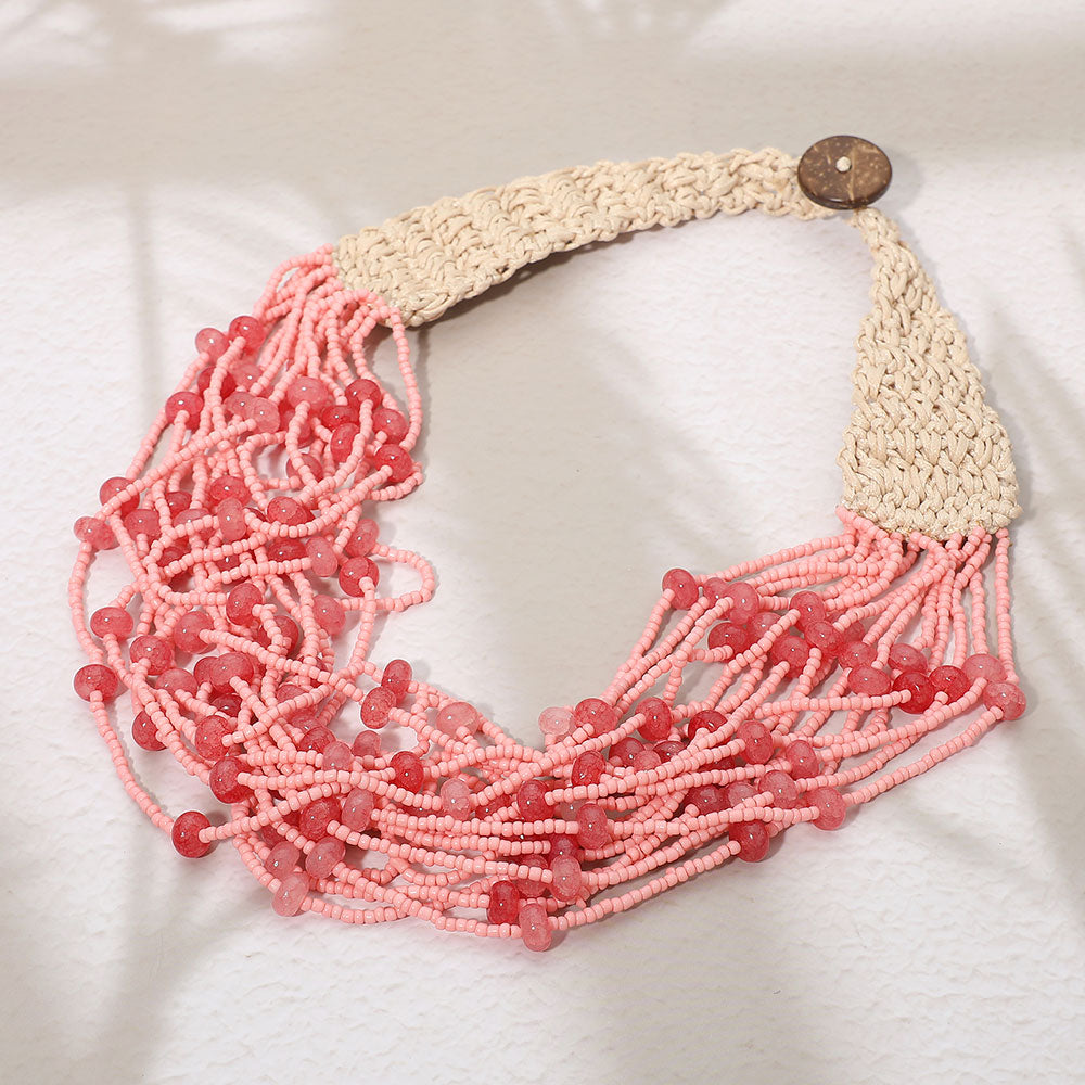 A bold collar-style necklace featuring multiple woven strands of seed beads for rich texture and dimension. Designed to sit beautifully at the neckline, it makes an eye-catching statement while remaining lightweight and easy to wear.